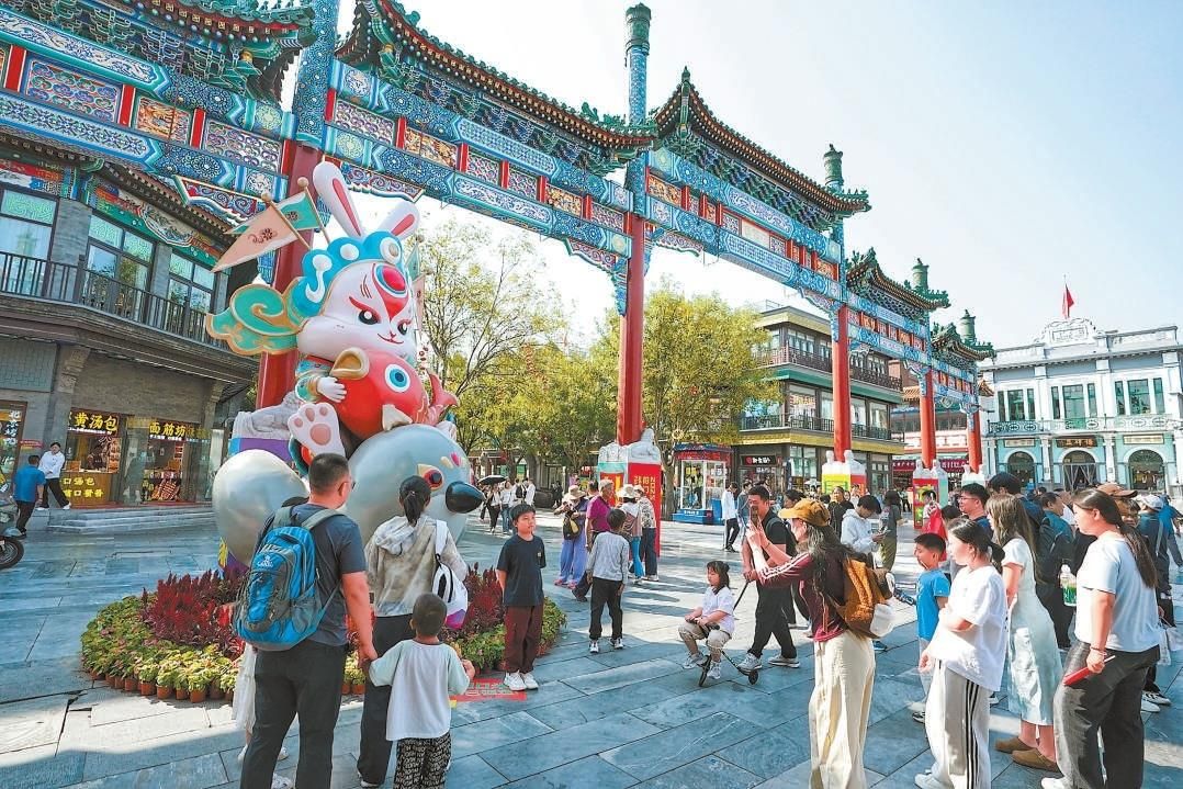 △双节假期,北京前门商业步行街游人如织,市民游客逛潮闪节、打卡“前门·中华美食荟”,感受中轴线的魅力。