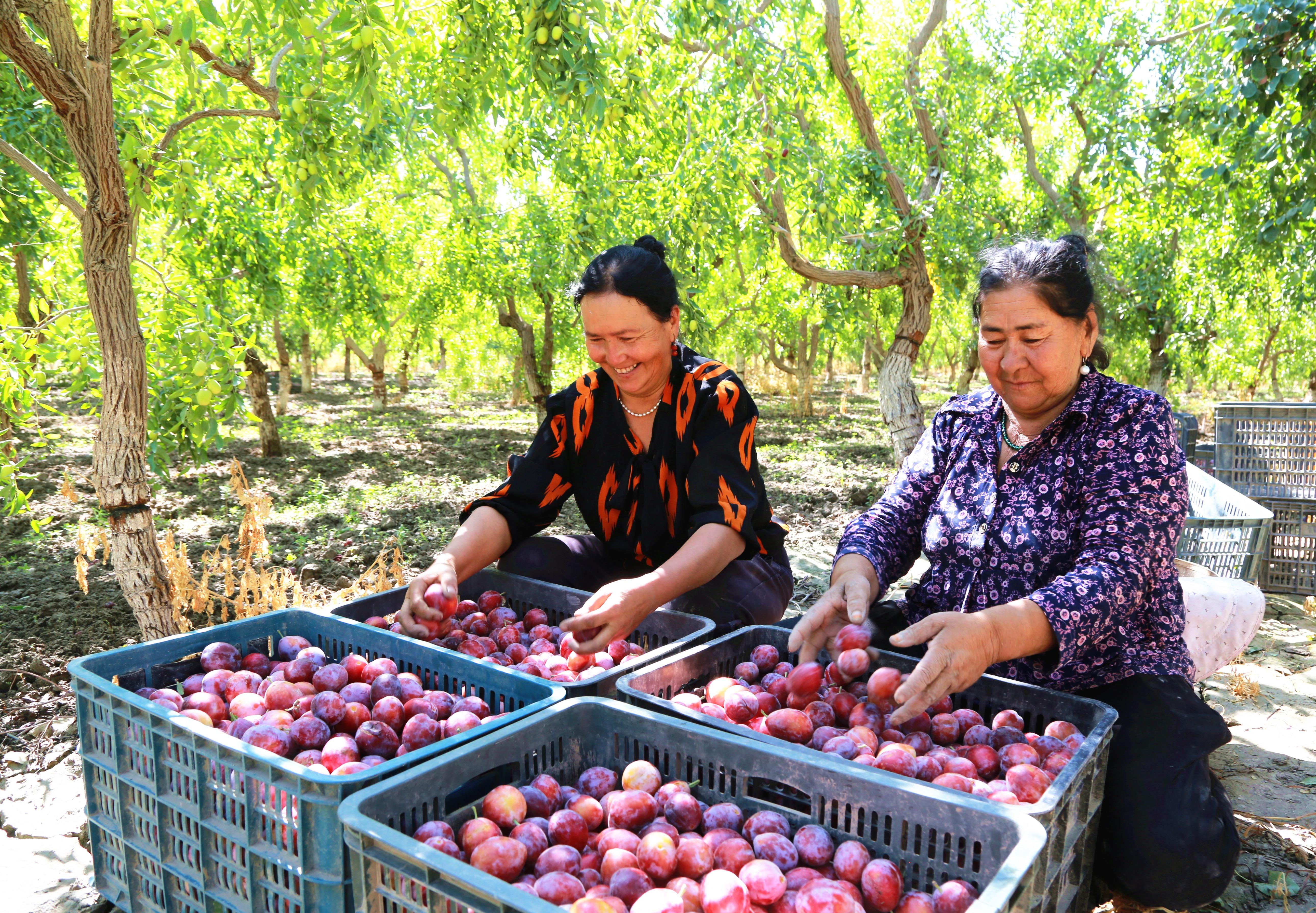 △2025年8月19日,新疆阿克苏地区阿瓦提县塔木托格拉克镇阿克亚村,果农分拣西梅。