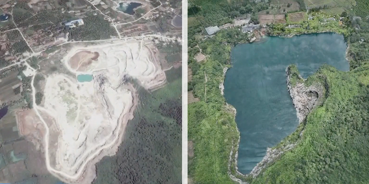 △浙江安吉曾经最大的石灰岩矿坑复绿改造后,变成有山有水的生态度假区。