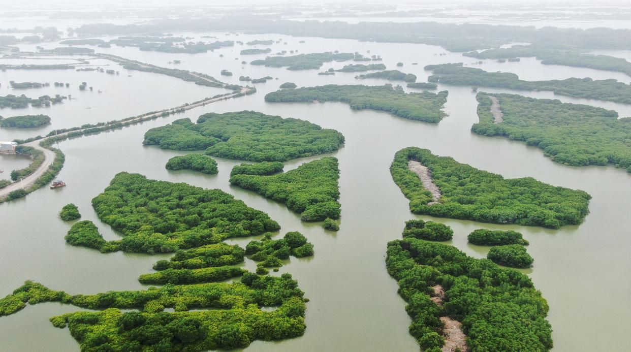 这是2023年4月10日拍摄的广东湛江红树林国家级自然保护区麻章金牛岛片区(无人机照片)。新华社记者 王瑞平 摄 红树林,这种扎根于海岸潮间带的胎生木本植物,对它的保护习近平总书记十分关注。