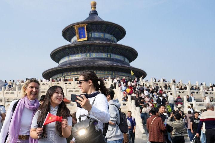△位于北京中轴线上的天坛公园祈年殿吸引众多游客游览。