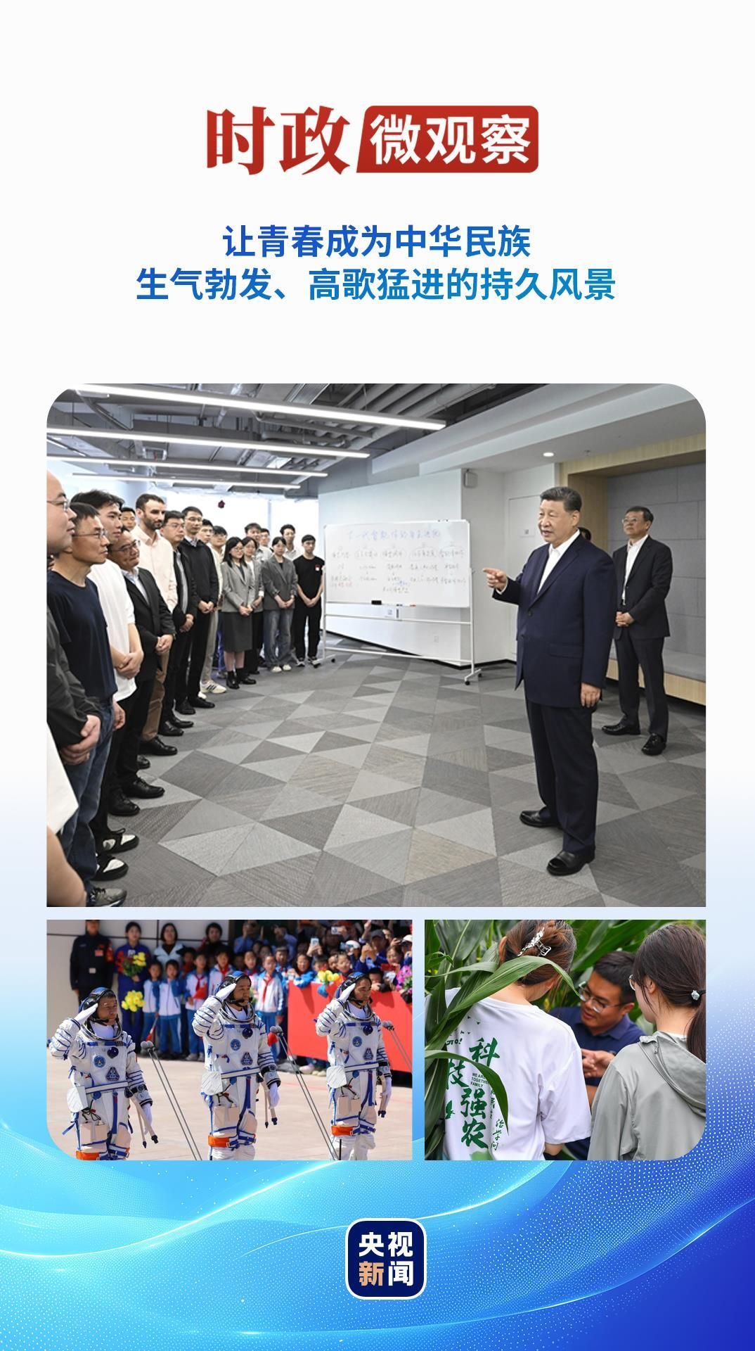 今年五四青年节前,习近平总书记再次来到年轻人中间。4月29日,在上海“模速空间”大模型创新生态社区,总书记同青年创新人才亲切交流,勉励大家“把个人奋斗同国家前途命运紧紧联系在一起,跑好历史的接力棒,在推进中国式现代化的宽广舞台上绽放绚丽的青春光彩”。