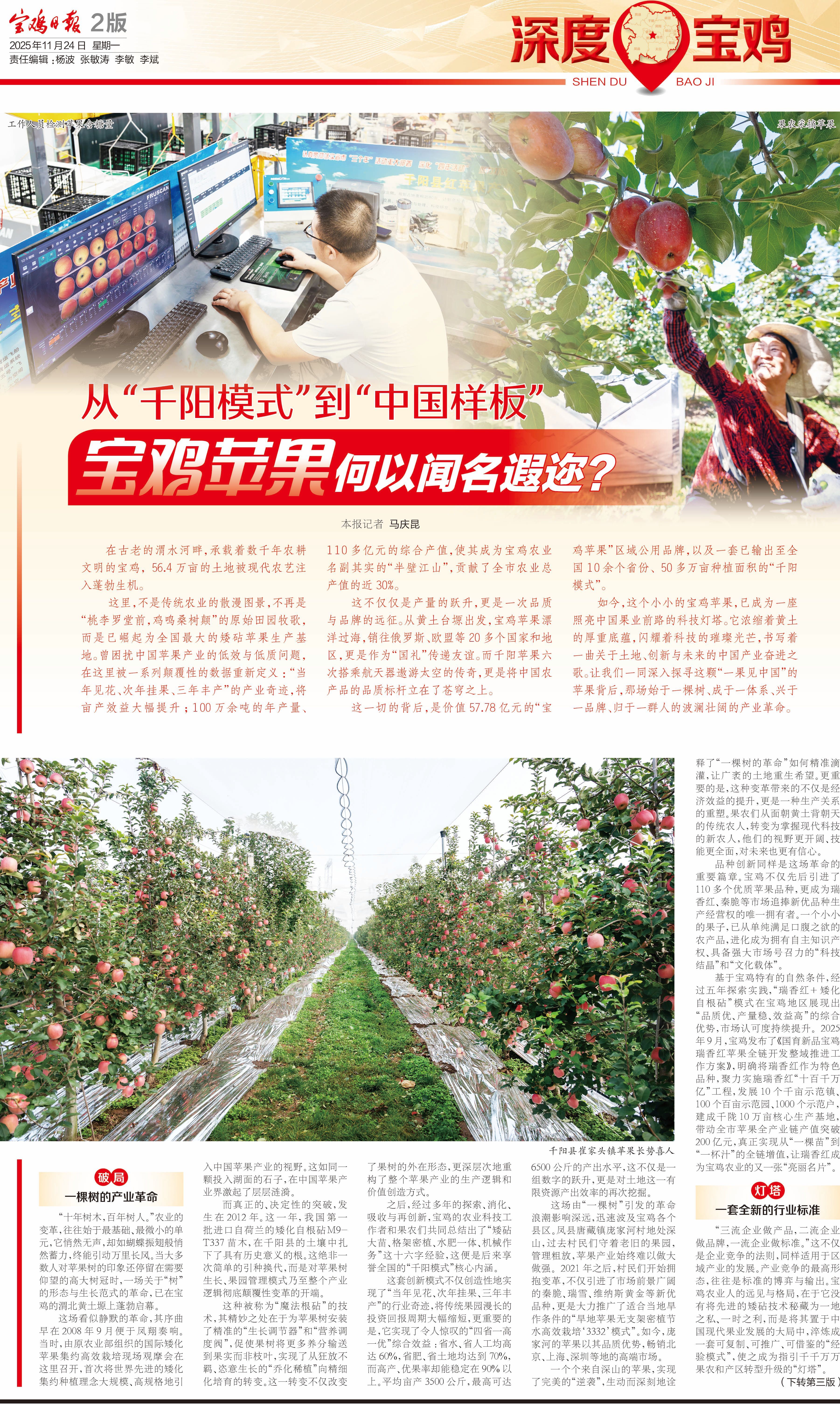 从“千阳模式”到“中国样板”,宝鸡苹果的亮眼,源于其拥抱变革的无畏勇气、制定标准的宏大格局、坚守匠心的执着定力与谋划未来的深邃智慧。这个“一果见中国”的苹果,它的未来,必将如星河般璀璨,照亮中国现代农业迈向更加广阔、更加辉煌的征途。(宝鸡融媒 马庆昆)