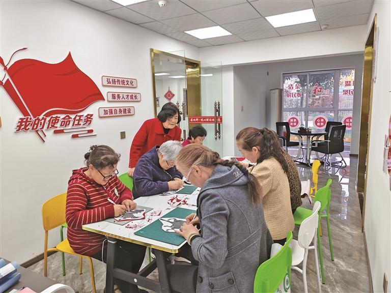 11月13日,在宝鸡市陈仓区厂区街道社区“若比邻·悦心”党群服务驿站,社区党总支书记、居委会主任付小艳和志愿者一边组织老年人学习传统剪纸技艺,一边和周边群众拉家常。