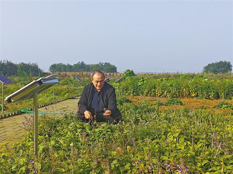 10月25日,在扶风县杏林镇东坡村的“百草园”里,东坡村党支部书记姚建友查看草药长势。