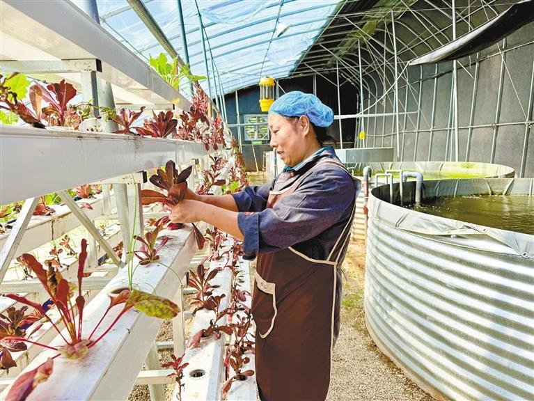 秋日的秦岭北麓,层林尽染。10月13日,记者走进宝鸡市渭滨区神农镇太平庄村秦岭四季春田园综合体,现代化温控大棚内水波粼粼,鲟鱼在池中游弋,水培架上的根达菜青翠欲滴,不远处,游客正兴致勃勃地体验罗氏虾垂钓……“养鱼不换水、种菜不施肥,这‘鱼菜共生’真是神奇!”来自甘肃天水的游客毛莉说。
