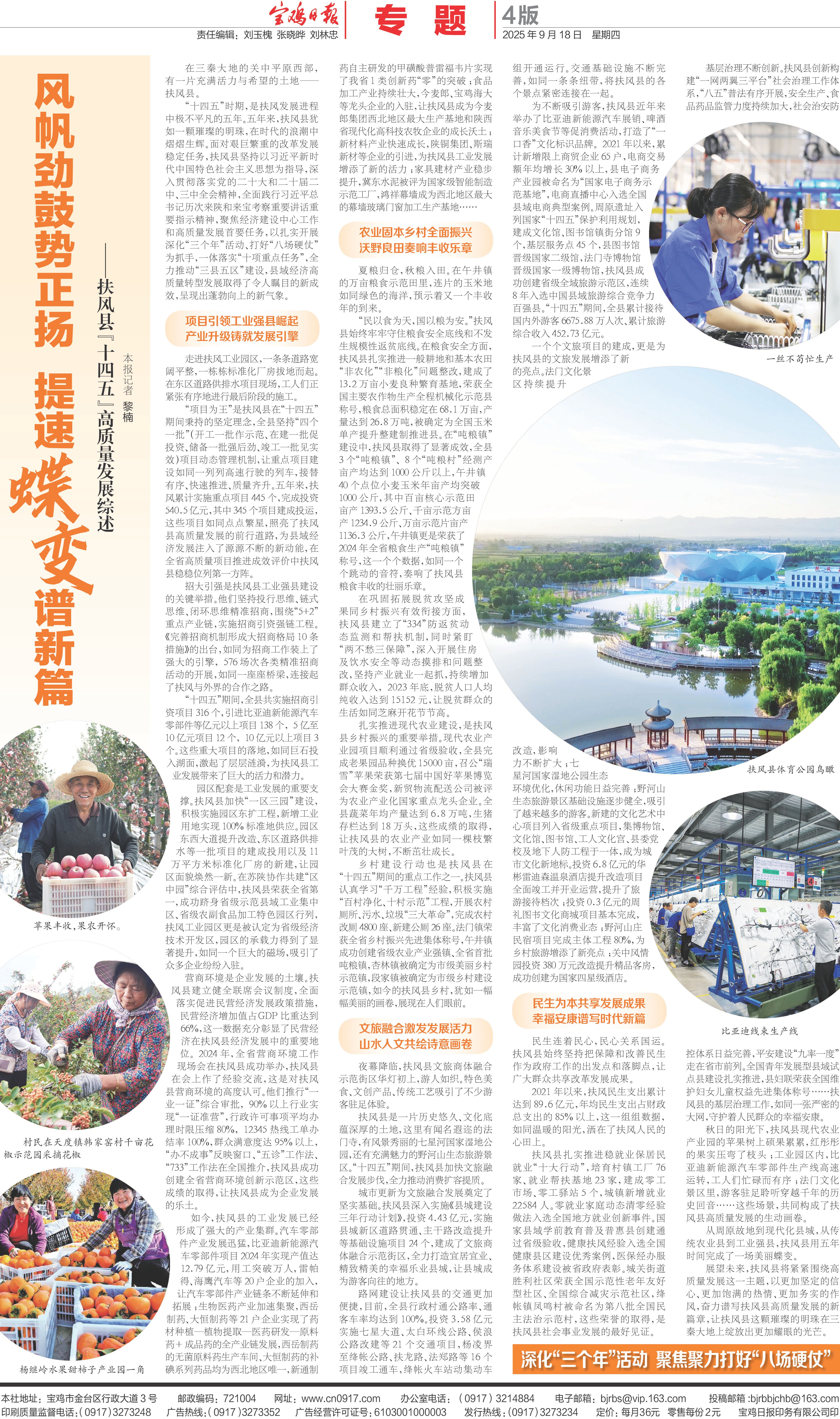 “十四五”时期,是扶风发展进程中极不平凡的五年。五年来,扶风县犹如一颗璀璨的明珠,在时代的浪潮中熠熠生辉。面对艰巨繁重的改革发展稳定任务,扶风县坚持以习近平新时代中国特色社会主义思想为指导,深入贯彻落实党的二十大和二十届二中、三中全会精神,全面践行习近平总书记历次来陕和来宝考察重要讲话重要指示精神,聚焦经济建设中心工作和高质量发展首要任务,以扎实开展深化“三个年”活动、打好“八场硬仗”为抓手,一体落实“十项重点任务”,全力推动“三县五区”建设,县域经济高质量转型发展取得了令人瞩目的新成效,呈现出蓬勃向上的新气象。