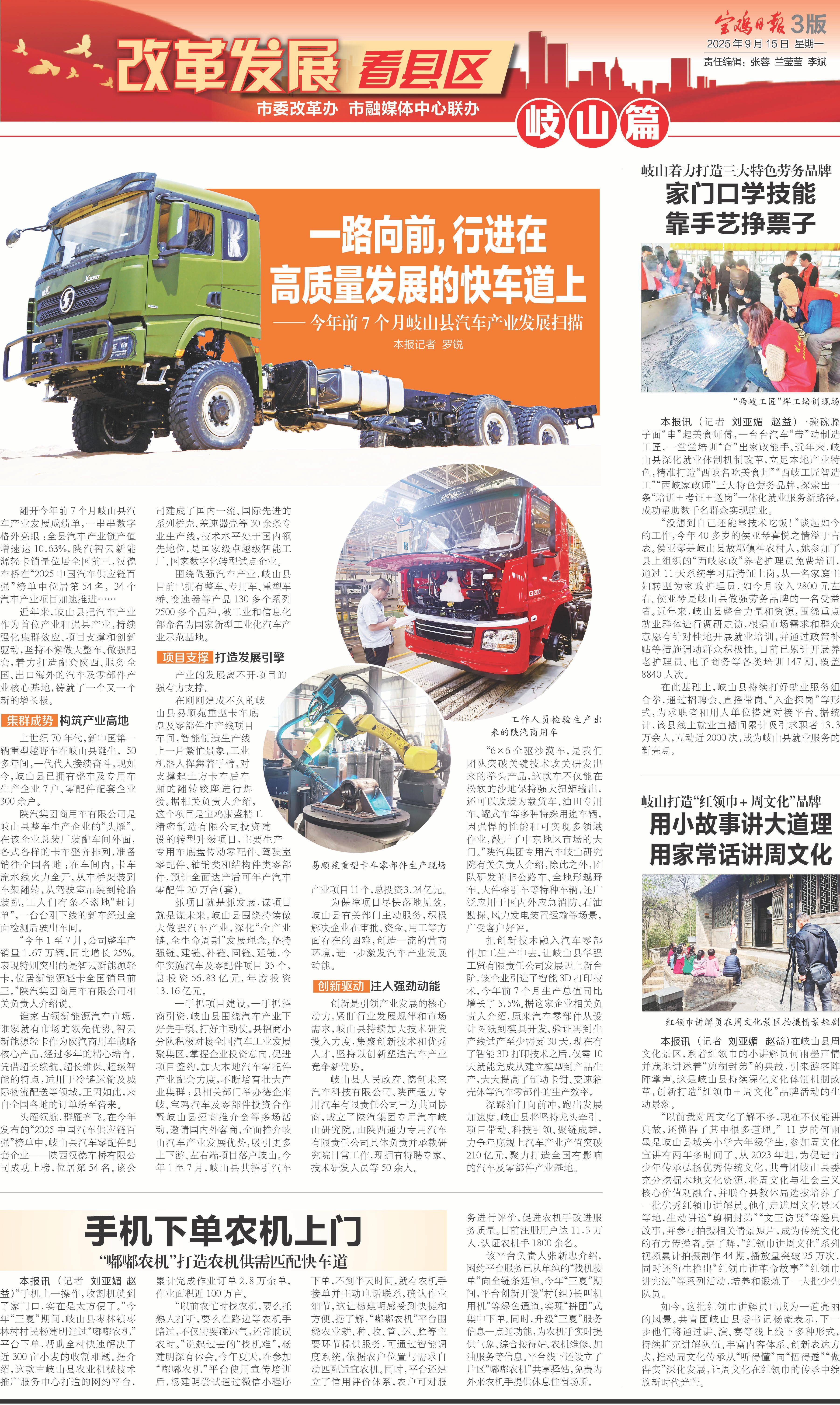 上世纪70年代,新中国第一辆重型越野车在岐山县诞生,50多年间,一代代人接续奋斗,现如今,岐山县已拥有整车及专用车生产企业7户、零配件配套企业300余户。