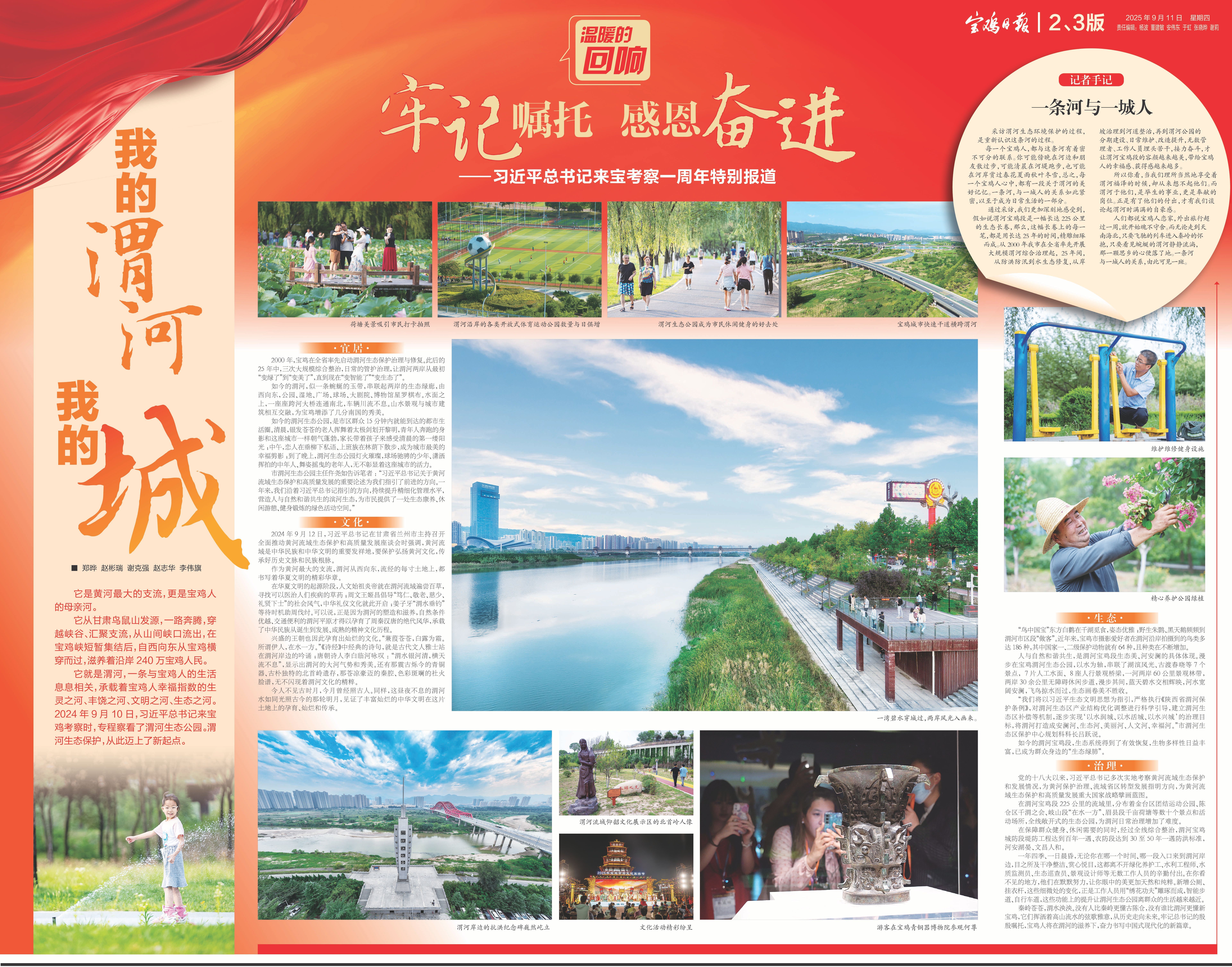 通过采访,我们更加深刻地感受到,假如说渭河宝鸡段是一幅长达225公里的生态长卷,那么,这幅长卷上的每一笔,都是用长达25年的时间,精雕细琢而成。从2000年我市在全省率先开展大规模渭河综合治理起,25年间,从防洪防汛到水生态修复,从岸坡治理到河道整治,再到渭河公园的分期建设、日常维护、改造提升,无数管理者、工作人员埋头苦干,接力奋斗,才让渭河宝鸡段的容颜越来越美,带给宝鸡人的幸福感、获得感越来越多。