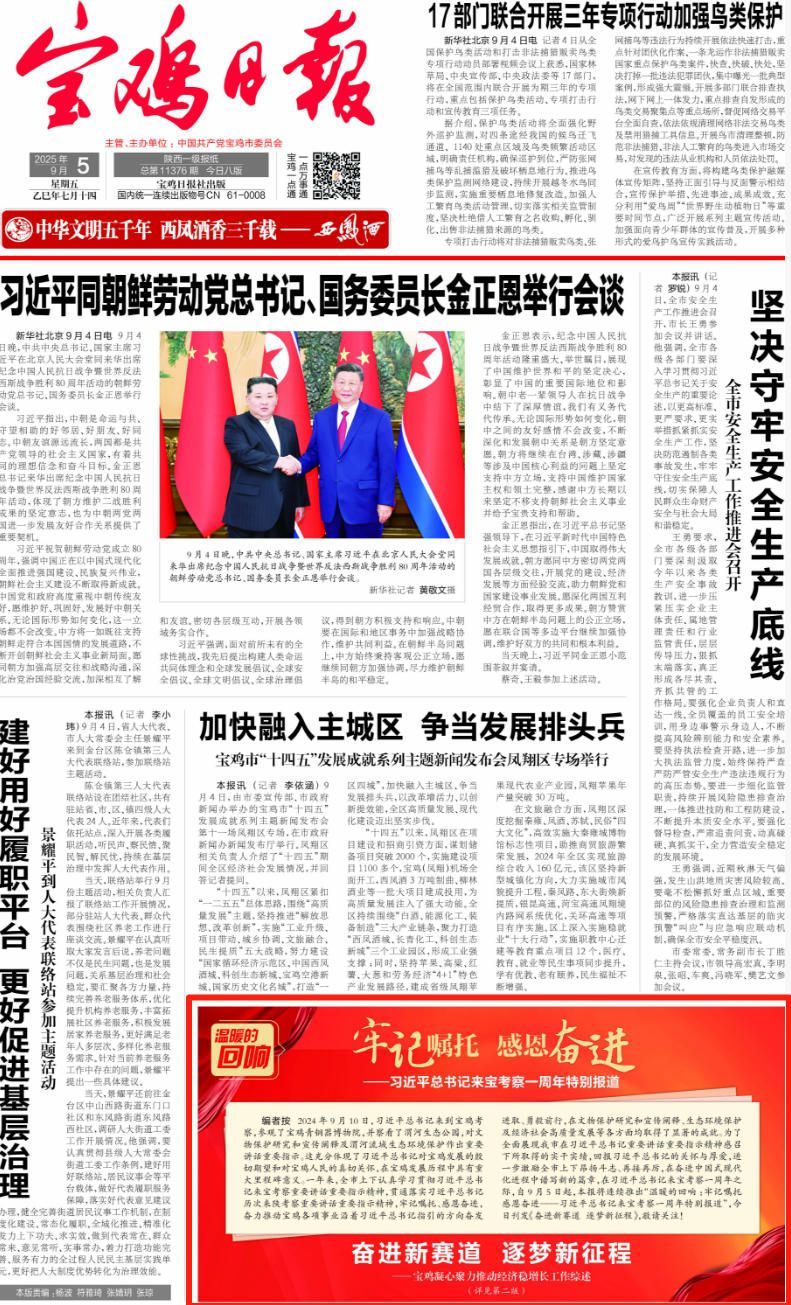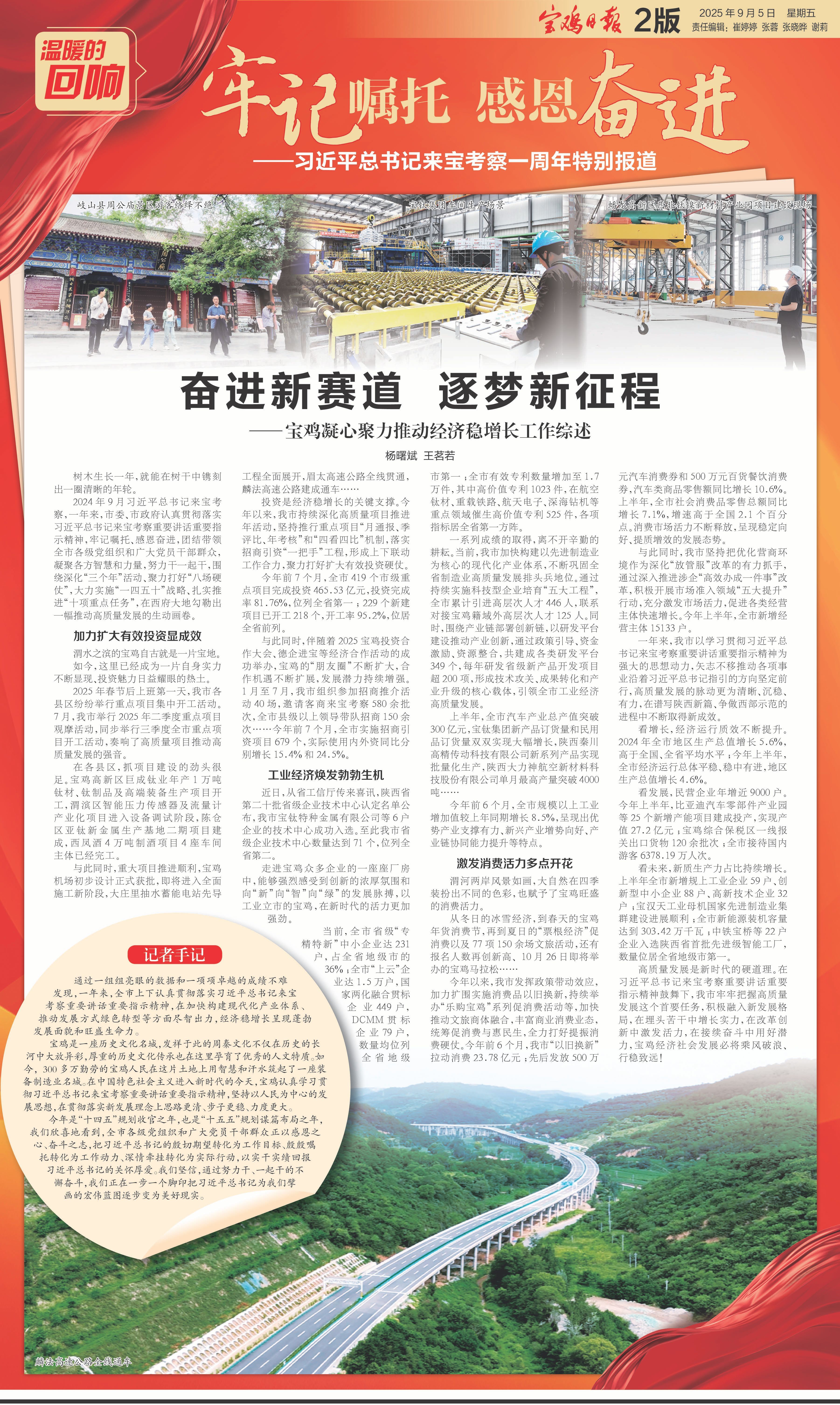 2024年9月10日,习近平总书记来到宝鸡考察,参观了宝鸡青铜器博物院,并察看了渭河生态公园,对文物保护研究和宣传阐释及渭河流域生态环境保护作出重要讲话重要指示。这充分体现了习近平总书记对宝鸡发展的殷切期望和对宝鸡人民的真切关怀,在宝鸡发展历程中具有重大里程碑意义。一年来,全市上下认真学习贯彻习近平总书记来宝考察重要讲话重要指示精神,贯通落实习近平总书记历次来陕考察重要讲话重要指示精神,牢记嘱托、感恩奋进,奋力推动宝鸡各项事业沿着习近平总书记指引的方向奋发进取、勇毅前行,在文物保护研究和宣传阐释、生态环境保护及经济社会高质量发展等各方面均取得了显著的成就。为了全面展现我市在习近平总书记重要讲话重要指示精神感召下所取得的实干实绩,回报习近平总书记的关怀与厚爱,进一步激励全市上下昂扬斗志、再接再厉,在奋进中国式现代化进程中谱写新的篇章,在习近平总书记来宝考察一周年之际,自9月5日起,宝鸡日报将连续推出“温暖的回响:牢记嘱托感恩奋进——习近平总书记来宝考察一周年特别报道”,今日刊发《奋进新赛道 逐梦新征程》,敬请关注!