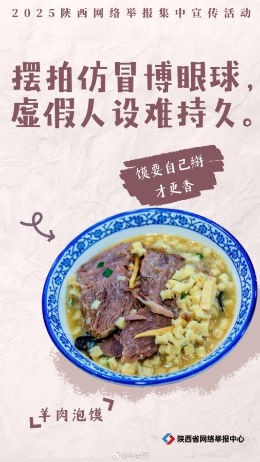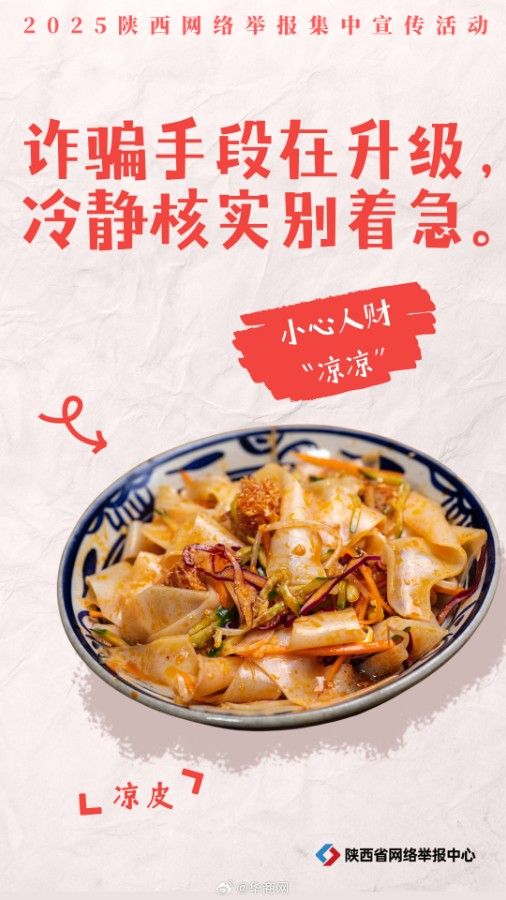 当上网遇到不良信息,如何正确网络举报?凉皮提醒:小心人财“凉凉”,莫入骗局。肉夹馍告诫:“馍”违法,小心双手被“夹”。陕西美食手把手教你舌尖上的举报指南,速速get。
