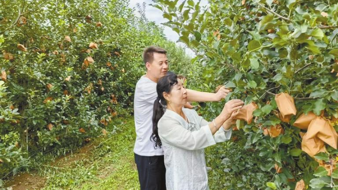 7月23日,韩英杰(左)在苹果园里指导群众管护果树。陕西日报记者 李静茹摄