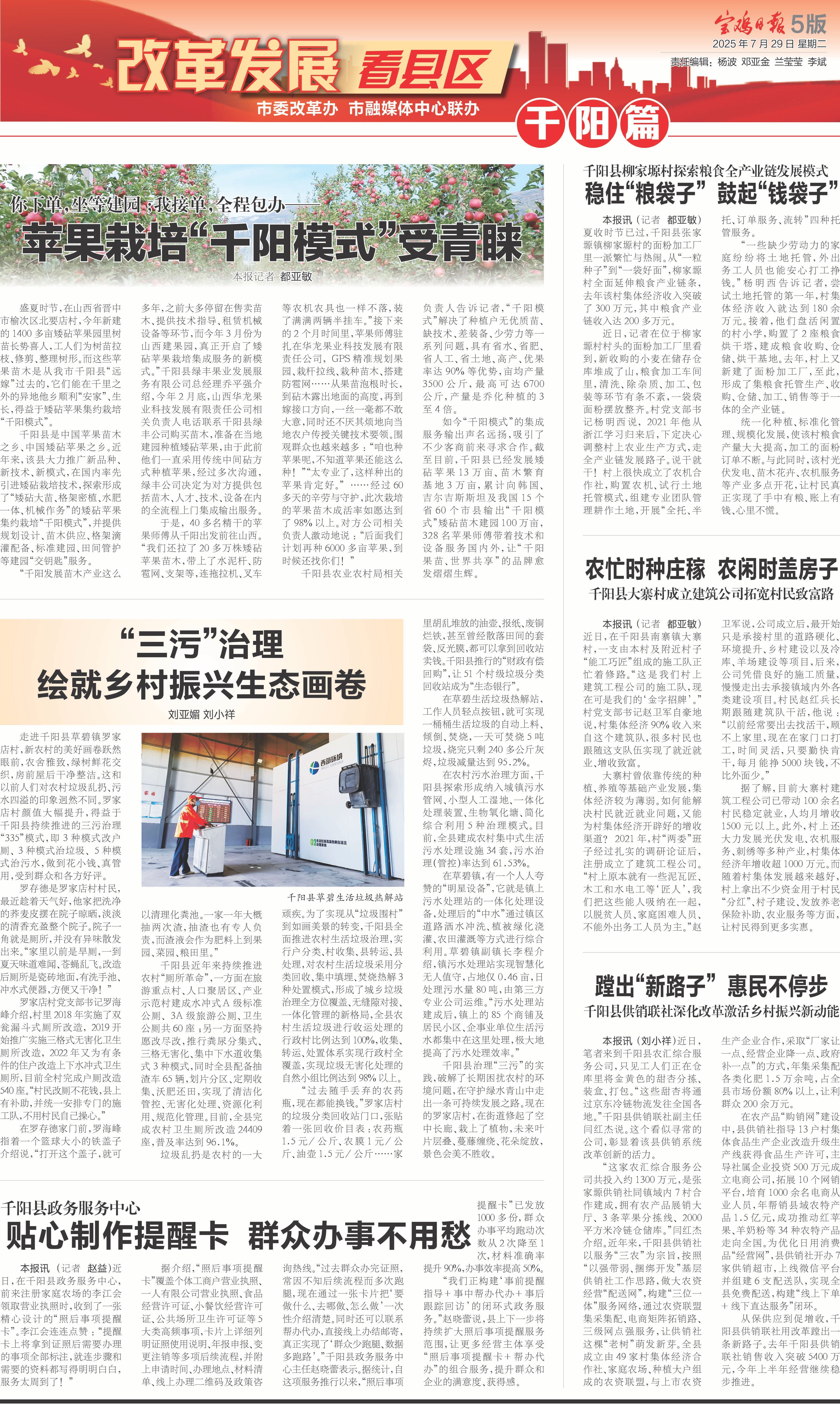 千阳县是中国苹果苗木之乡、中国矮砧苹果之乡。近年来,该县大力推广新品种、新技术、新模式,在国内率先引进矮砧栽培技术,探索形成了“矮砧大苗、格架密植、水肥一体、机械作务”的矮砧苹果集约栽培“千阳模式”,并提供规划设计、苗木供应、格架滴灌配备、标准建园、田间管护等建园“交钥匙”服务。