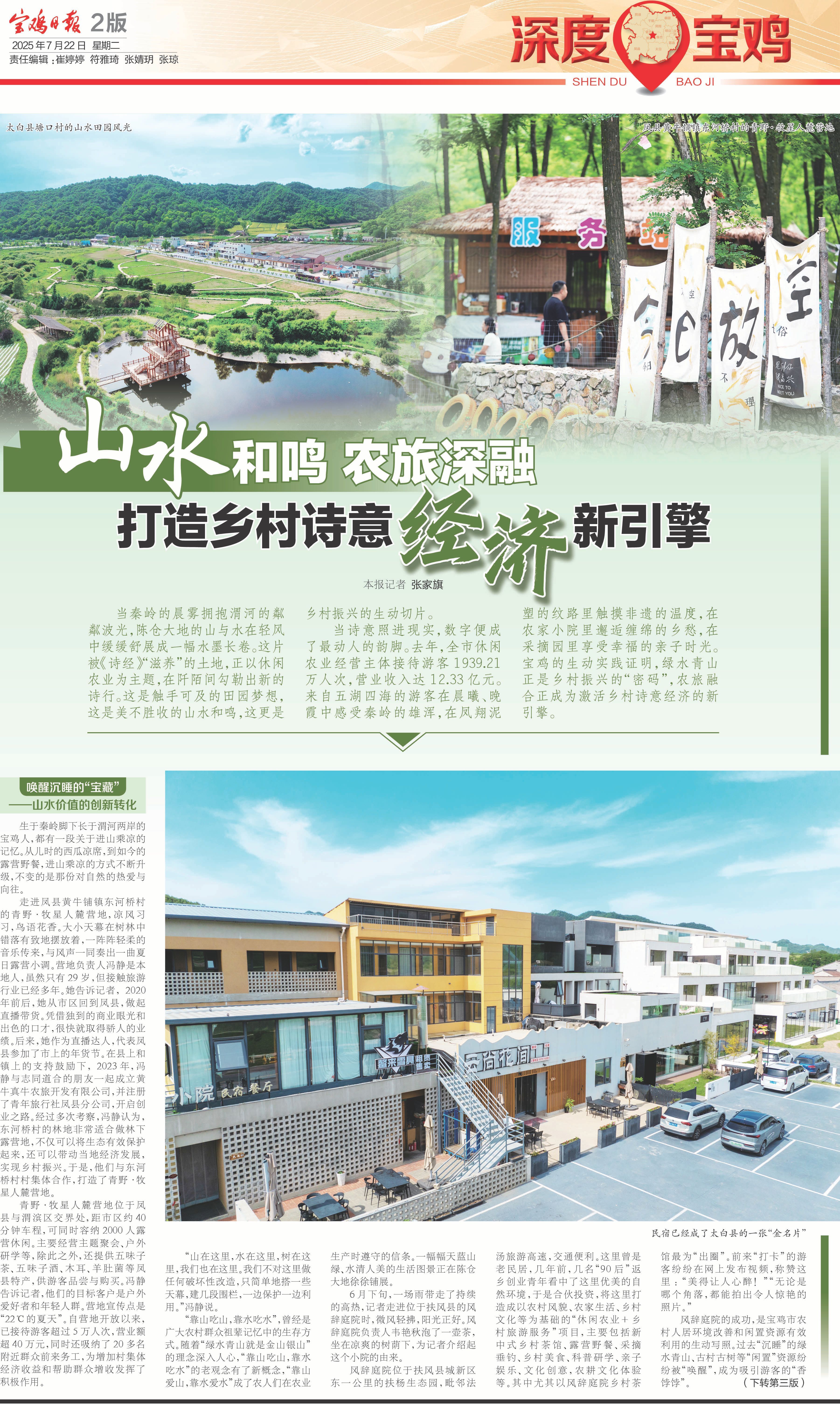 从田间到云端,从农舍到景区,宝鸡正以“农旅融合”为指引,将沉睡的山水资源转化为“诗与远方”的流量密码。数据显示,今年1至6月,全市休闲农业经营主体接待游客达到1000万人次,营业收入突破6亿元。绿水青山的生态价值,正通过农旅融合的创意实践,化作乡村振兴的澎湃动能。