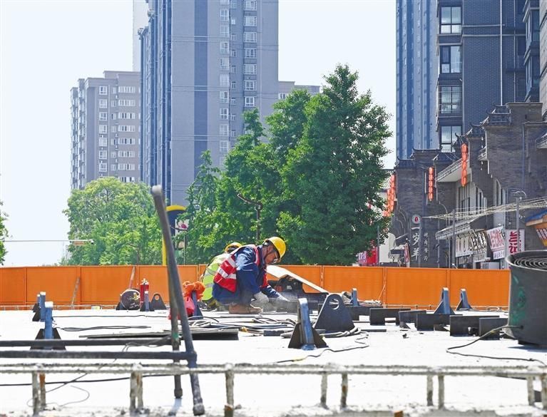 六月十二日,在宝鸡市渭滨区石坝河桥建设现场,施工人员在作业。 陕西日报记者 李静茹摄