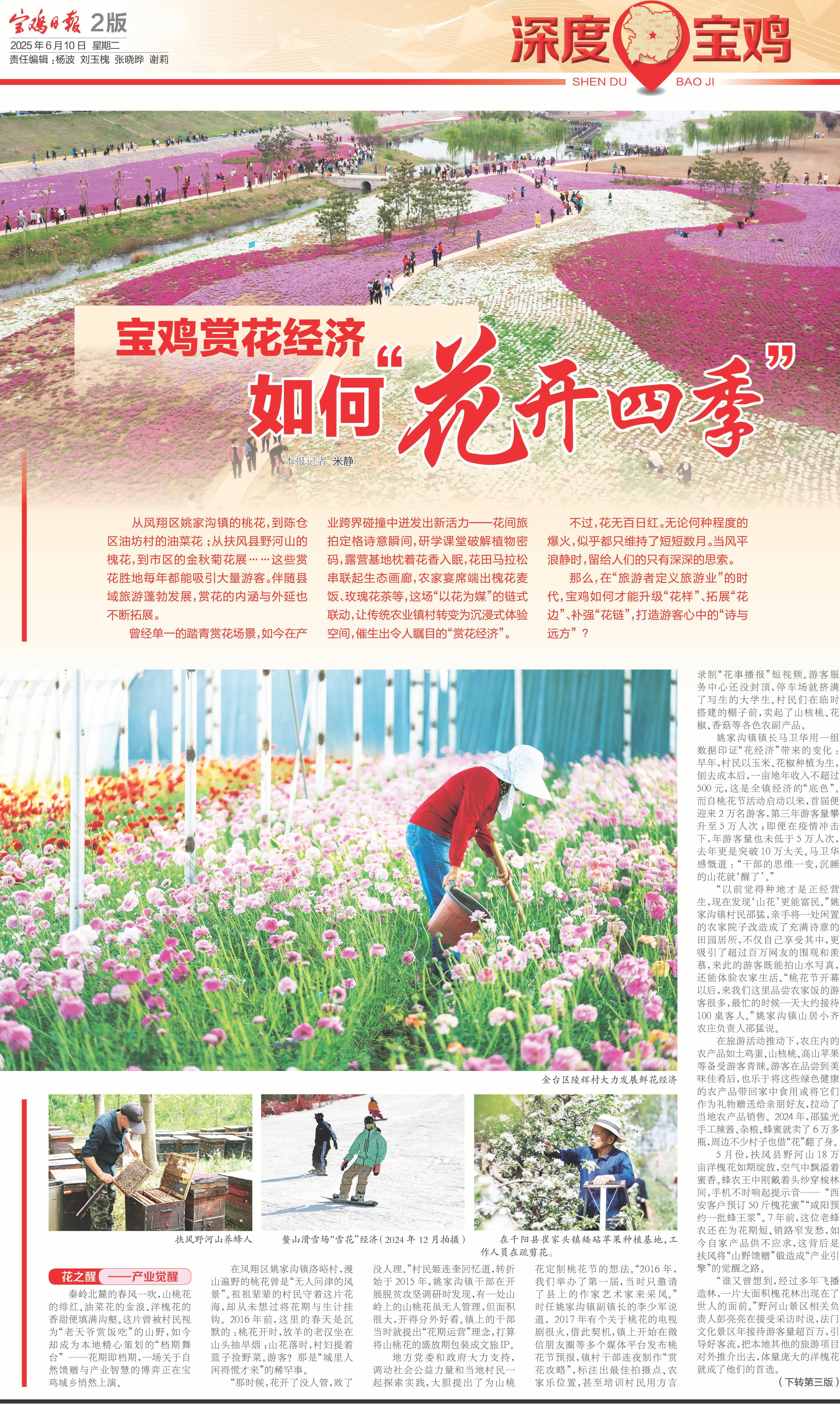 宝鸡的花海经济正站在转型升级的十字路口。在接受采访时,一些专家建议,人们需要的不是更多雷同的网红打卡地,而是能够贯通一二三产的“花样工坊”。各地要深入挖掘“赏花经济”在休闲康养、农耕体验、研学旅行等方面的价值,将“赏花经济”与文化艺术、都市休闲、运动健康、乡村度假、非遗体验、主题集市等业态有机融合,联动地摊经济、夜市经济、直播经济等特色消费元素,形成跨界合作模式,以更好地放大“赏花经济”的综合效应。