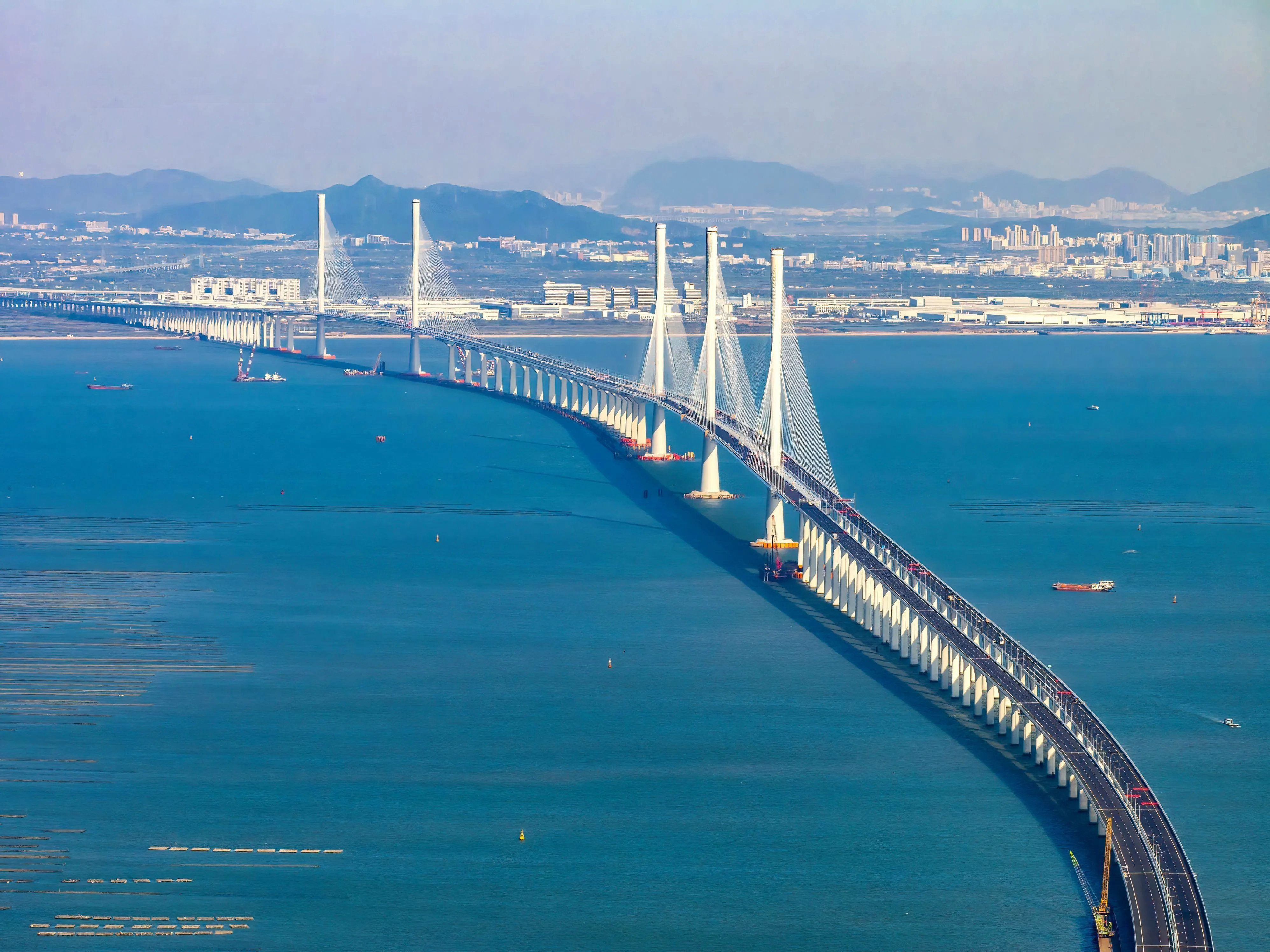 参建的深中大桥,2024年6月30日通车,是世界最大跨径全离岸海中钢箱梁悬索桥,主跨1666米,连接深圳、中山、广州三市。开通2小时,车流就达到1.6万辆,这条双向8车道的“超级工程”,开通即进入拥堵模式。参建的黄茅海大桥,是广东省连接珠海市与江门市的跨海通道核心工程,为世界最大三塔公路斜拉桥,全长2200米,于2024年12月11日通车运营。这两座大桥有力促进大湾区不断开创高质量发展、现代化建设的新局面!