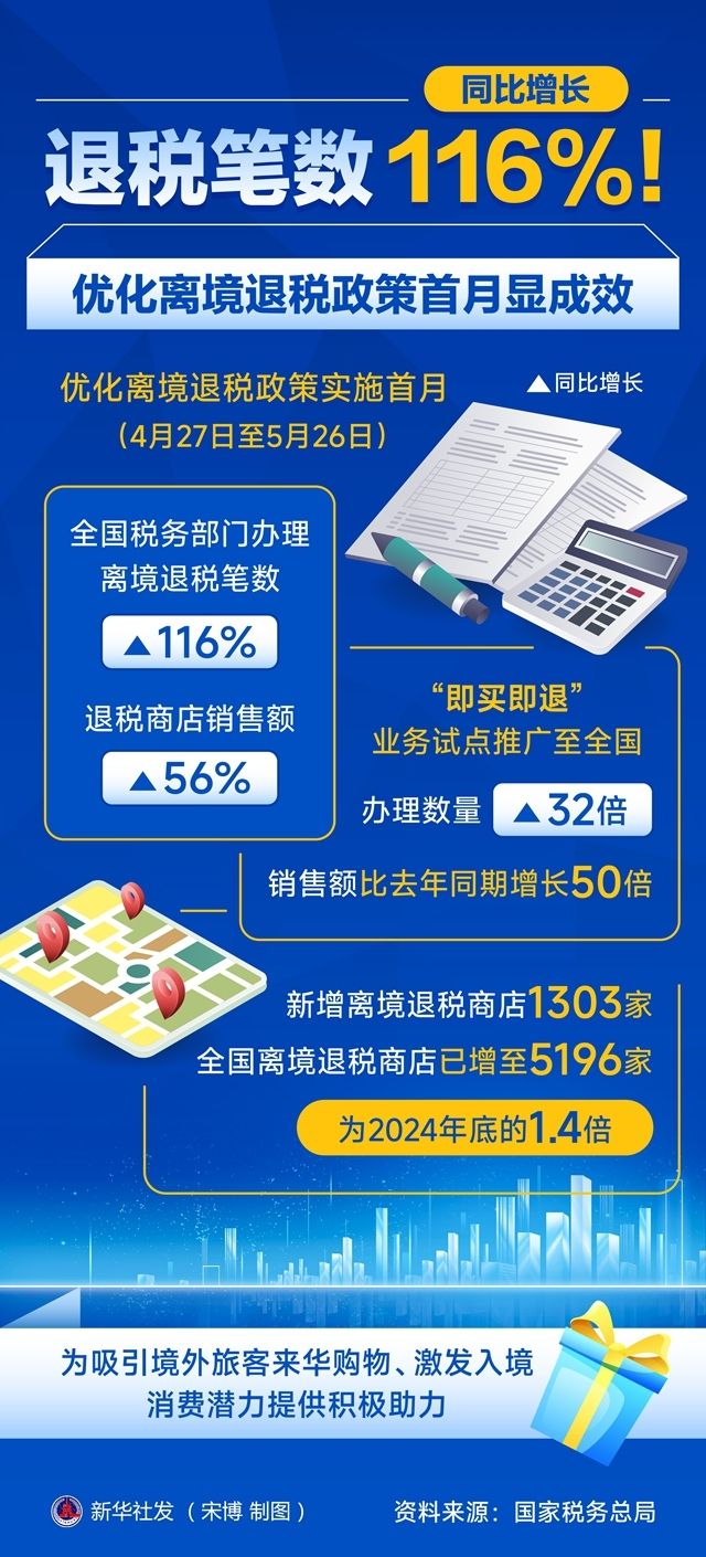 国家税务总局消息,优化离境退税政策实施首月,全国税务部门办理离境退税笔数同比增长116%。