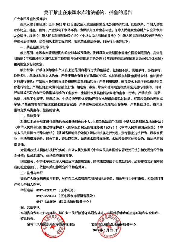 凤翔区发布关于禁止在东风水库违法垂钓、捕鱼的通告