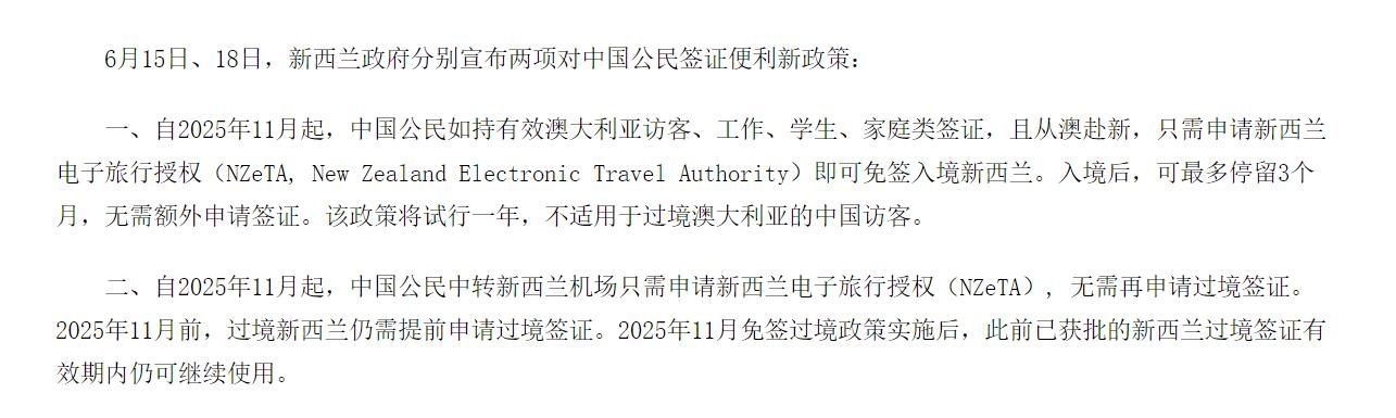 中国驻新西兰大使馆发文介绍,6月15日、18日,新西兰政府分别宣布两项对中国公民签证便利新政策。