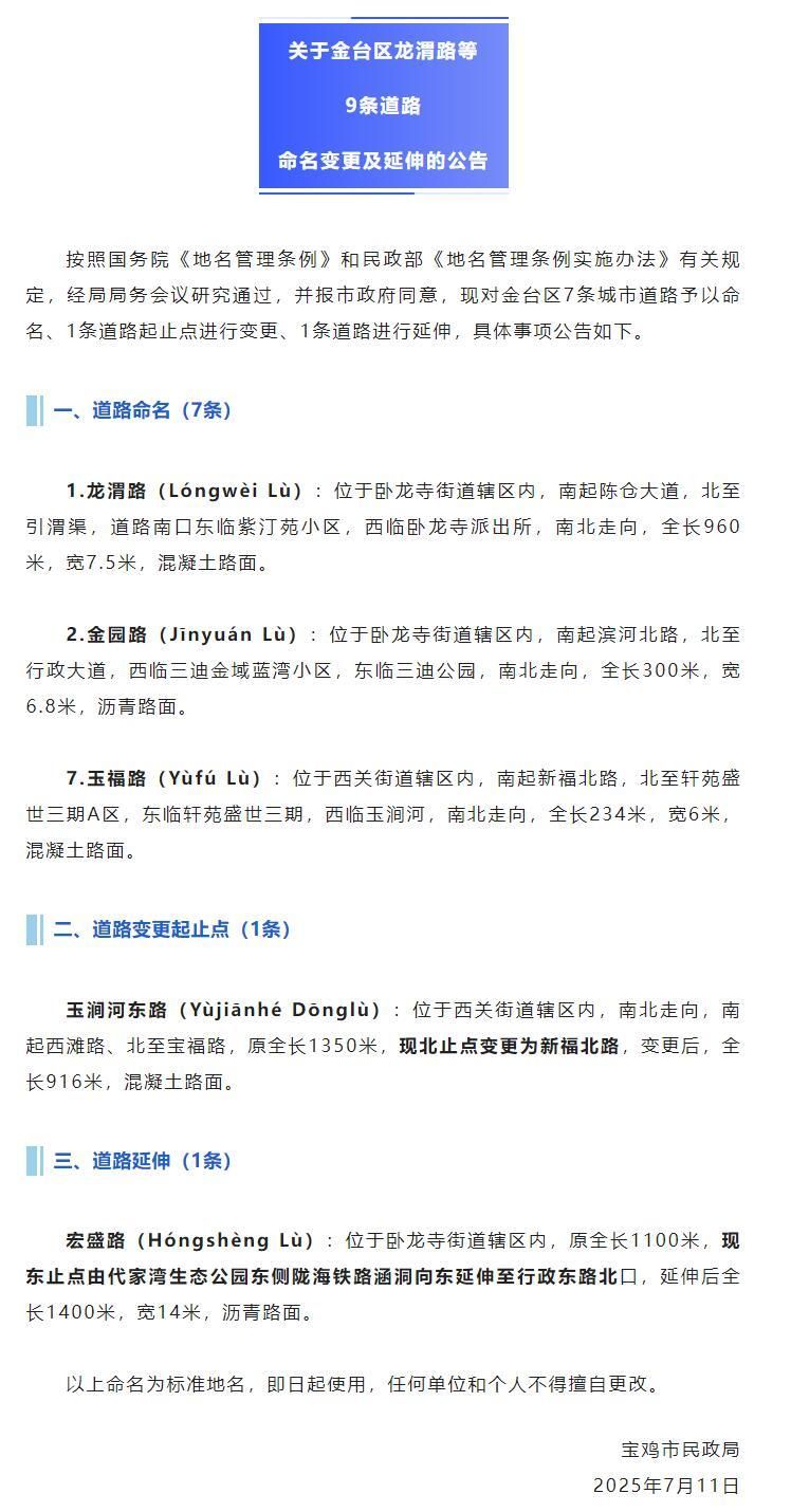 宝鸡市9条城市道路命名、变更及延伸