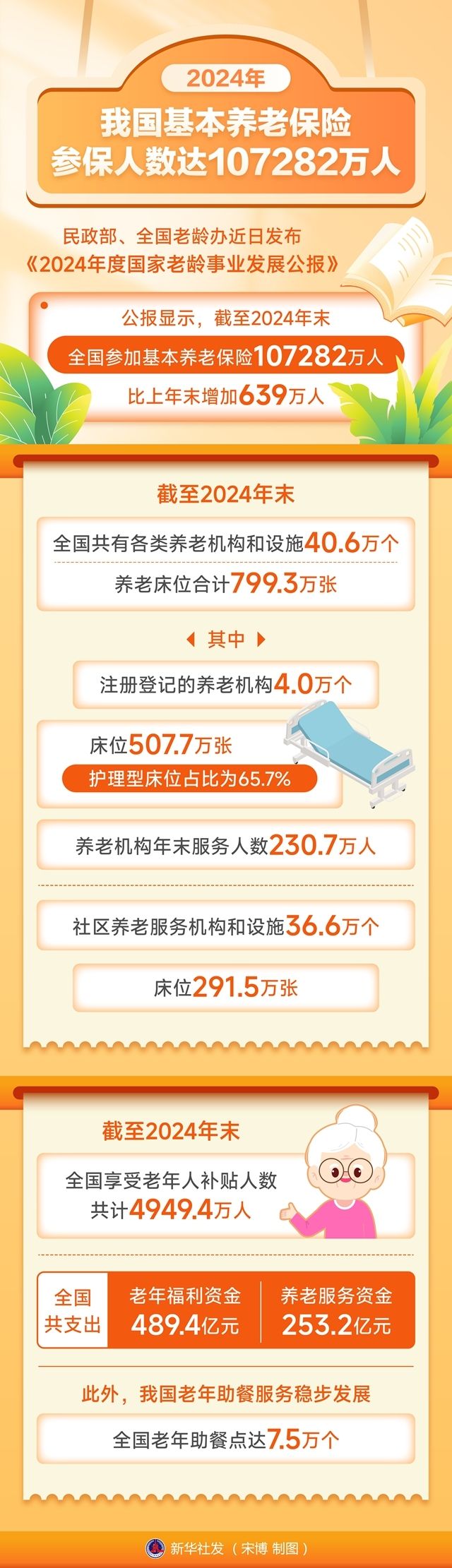 截至2024年末,全国参加基本养老保险107282万人,比上年末增加639万人。