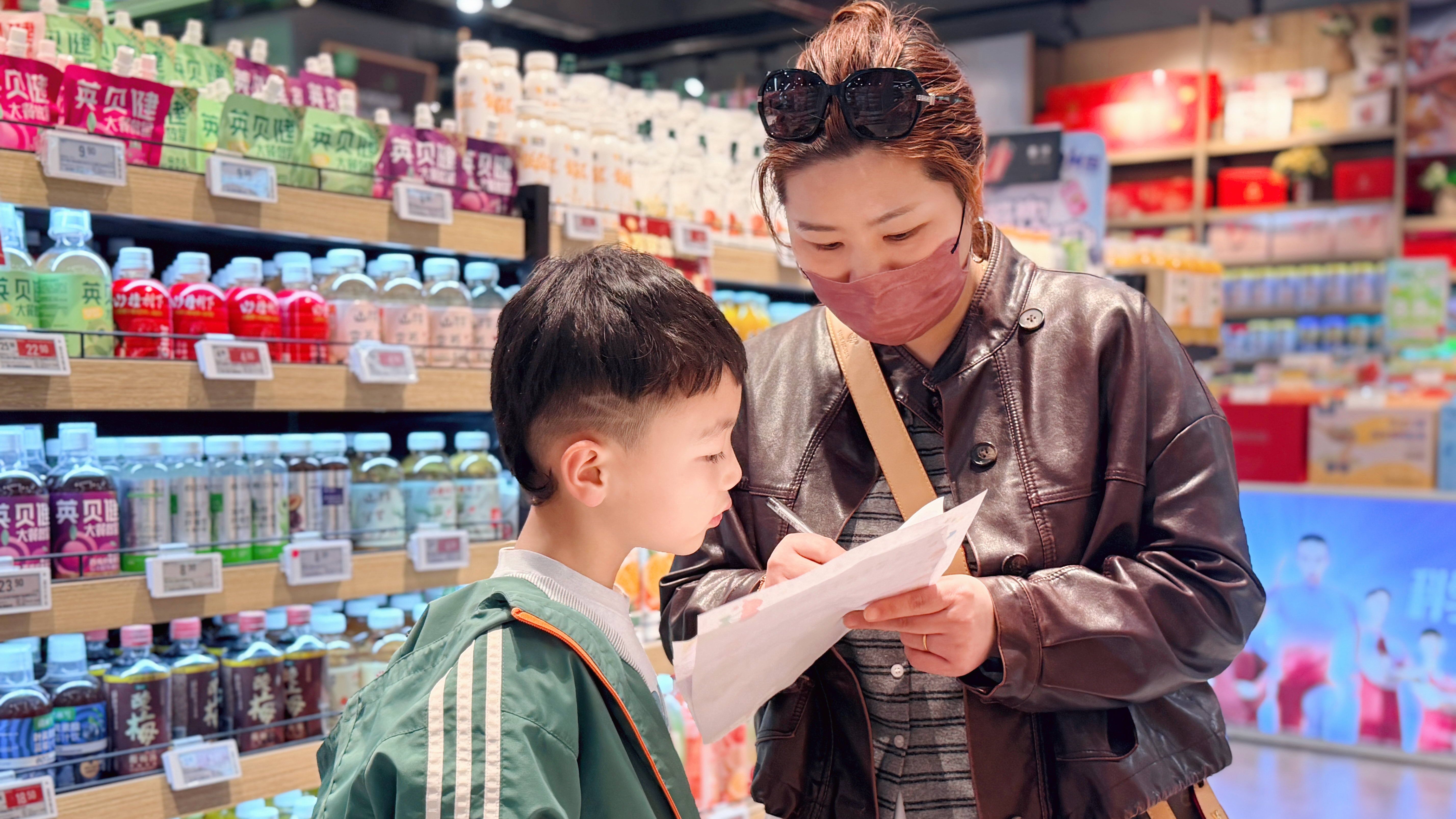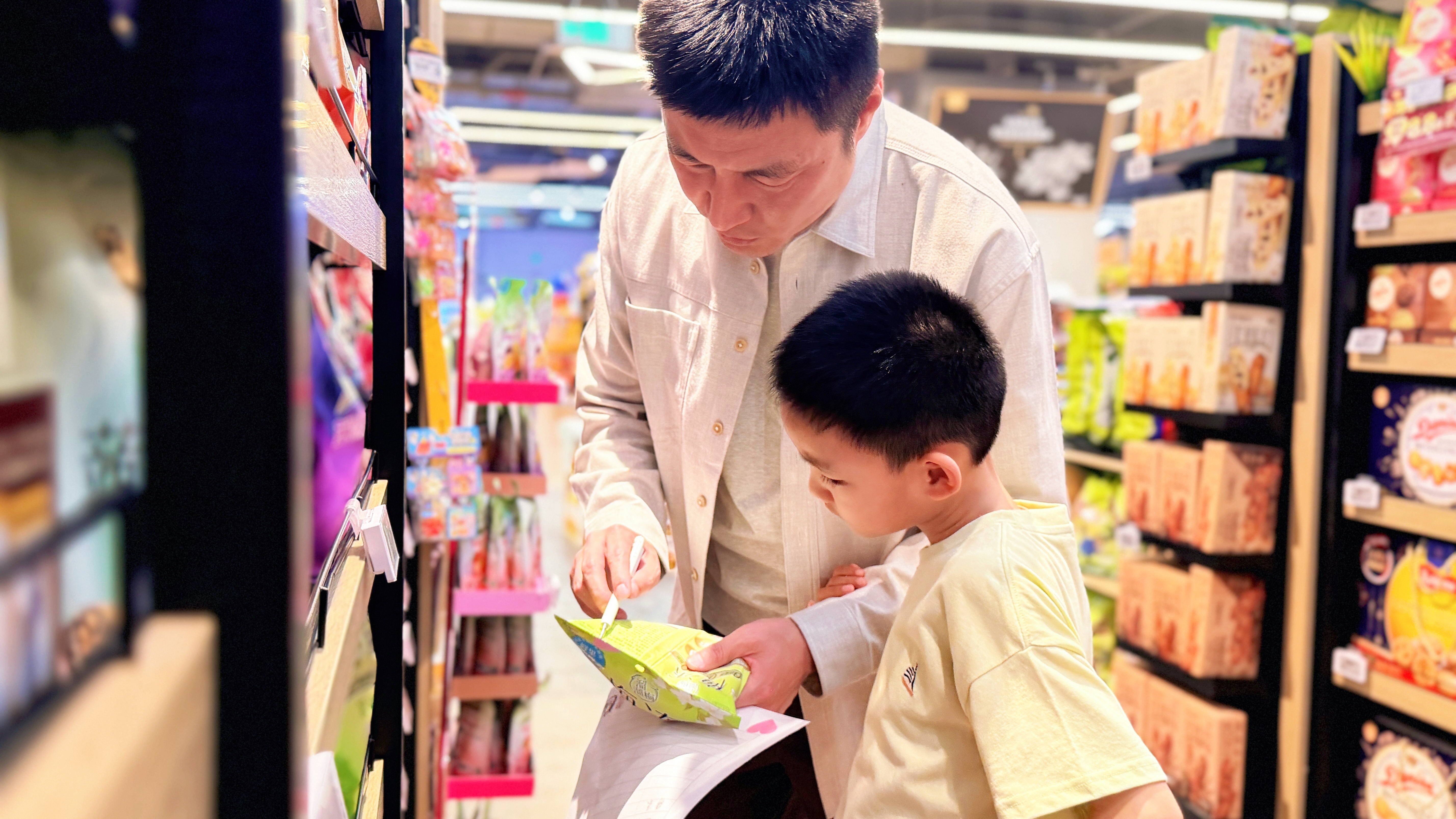 “配料健康小队”深入零食饮品区,尝试辨认配料表中的添加成分。