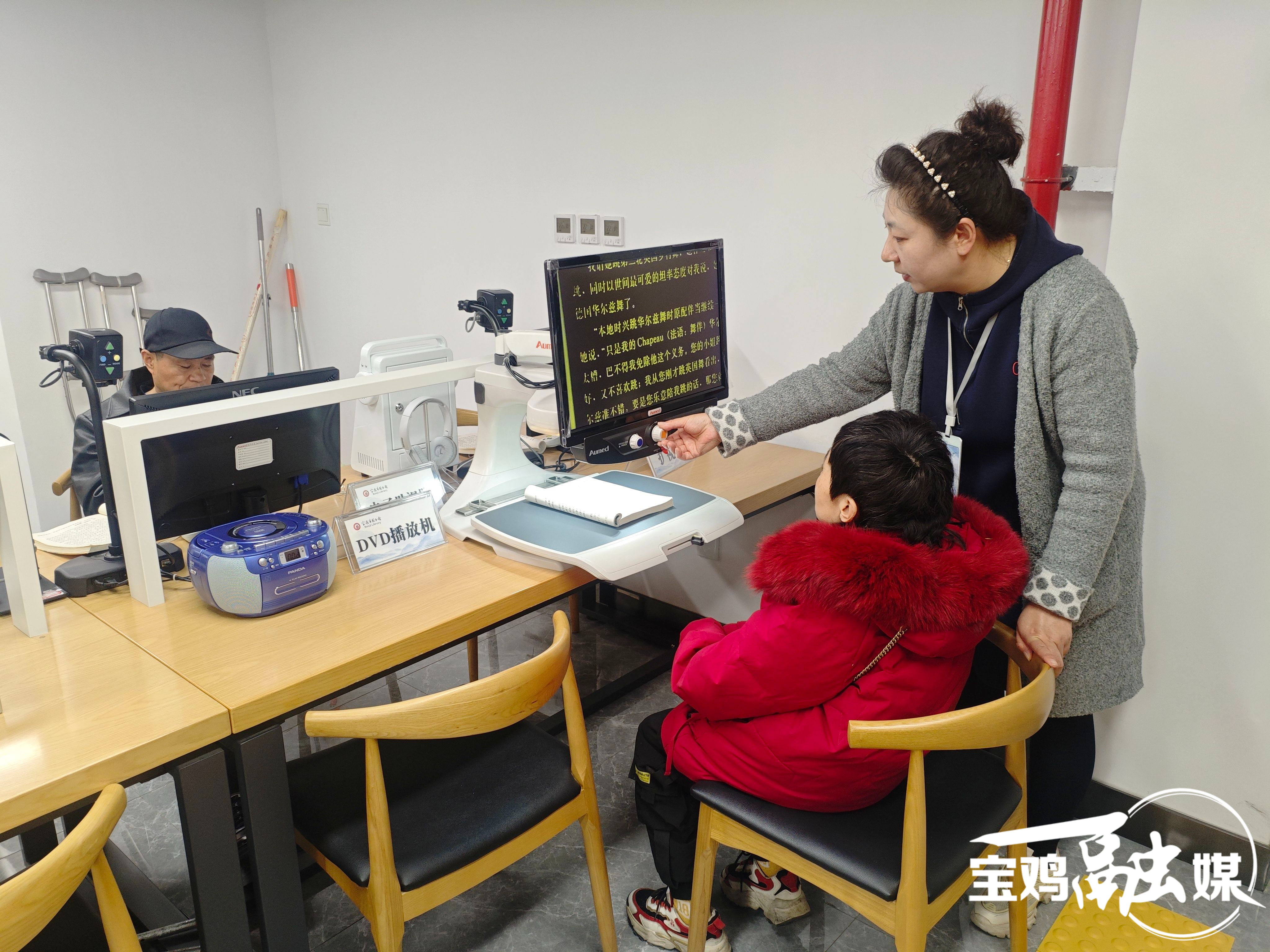 近日,宝鸡市图书馆的视障阅览室里书香满满,特殊读者们正在工作人员的指导下,借助馆内的扩视仪等相关设备进行阅读学习。在他们身后的书架上,许多大字本图书和盲文书刊排列整齐,不时有特殊读者在工作人员的帮助下过来查找翻阅自己喜欢的书籍。