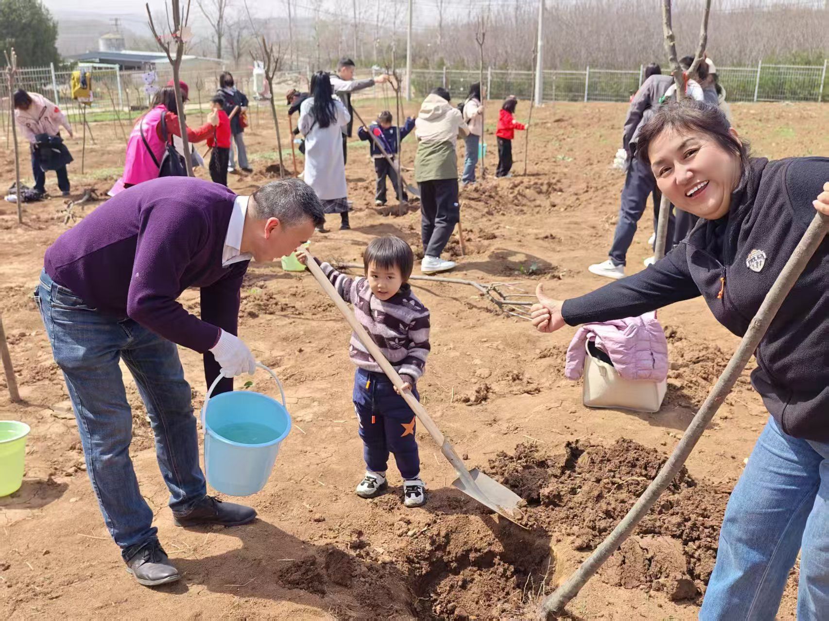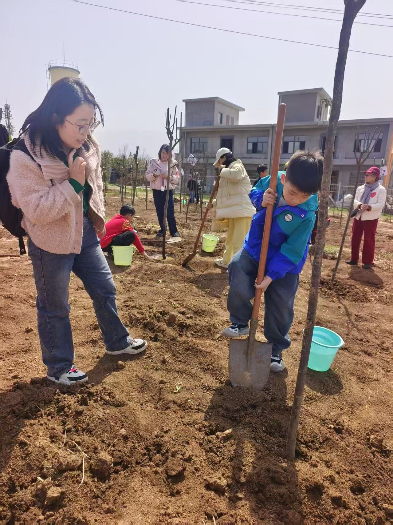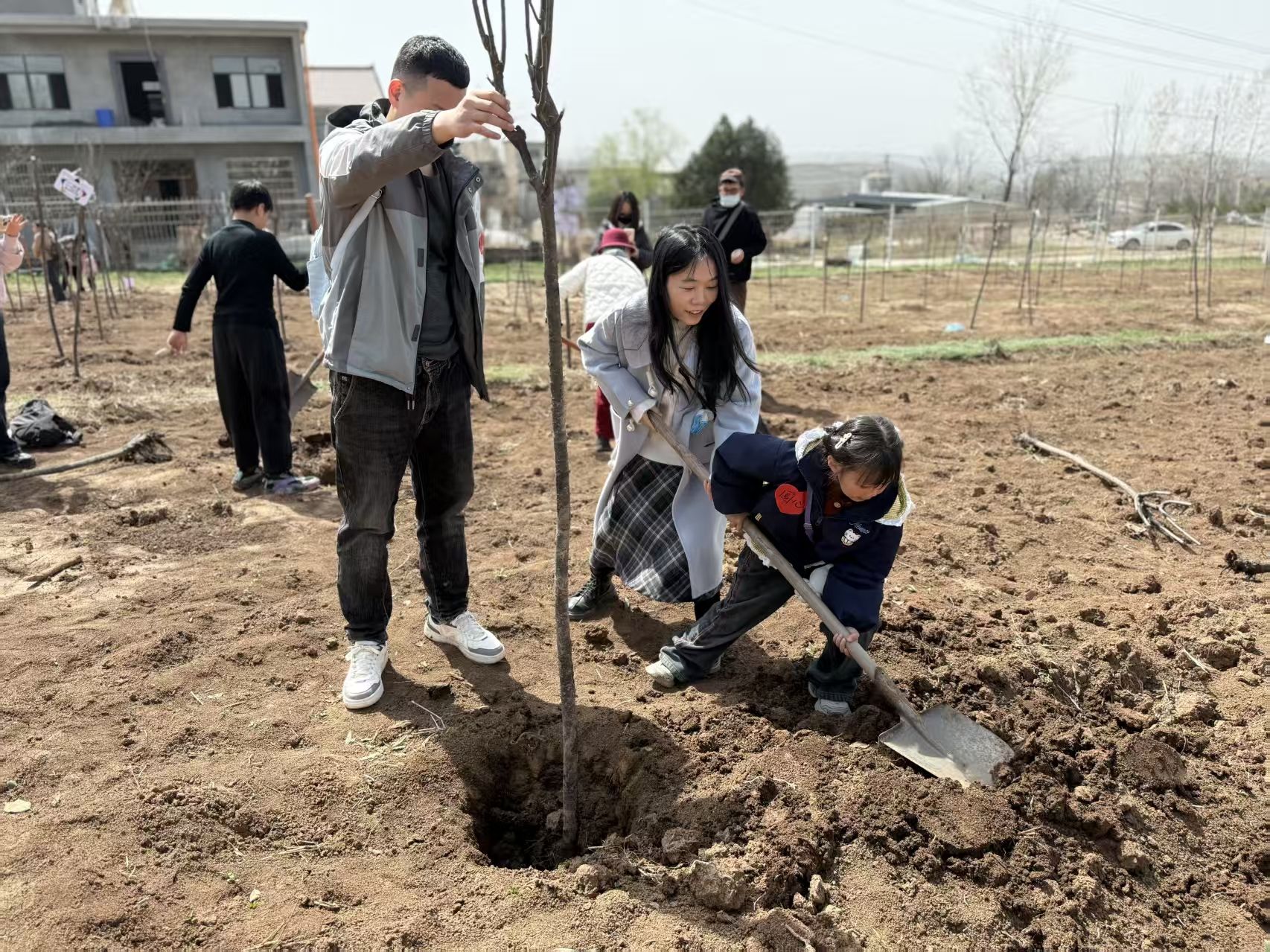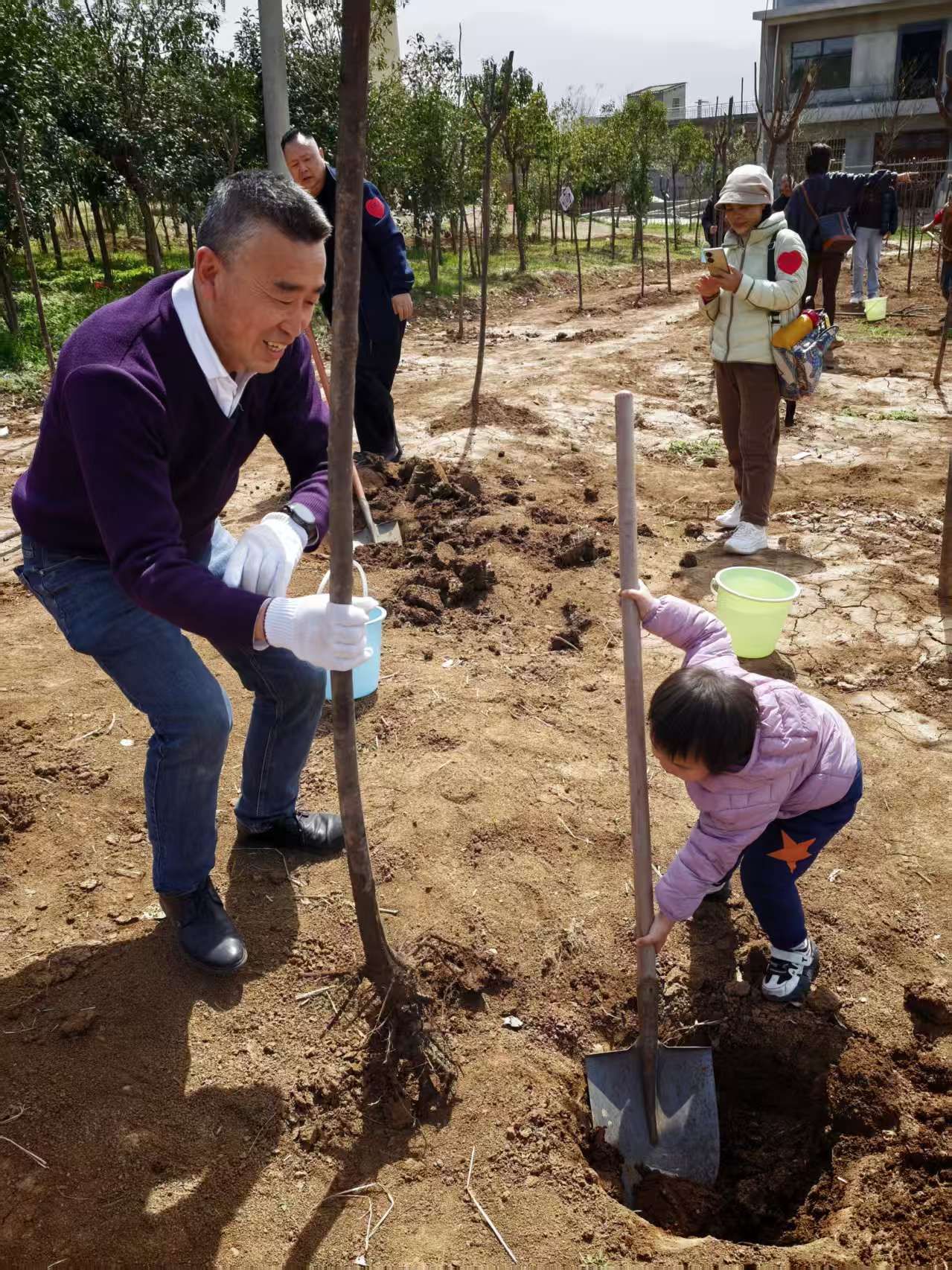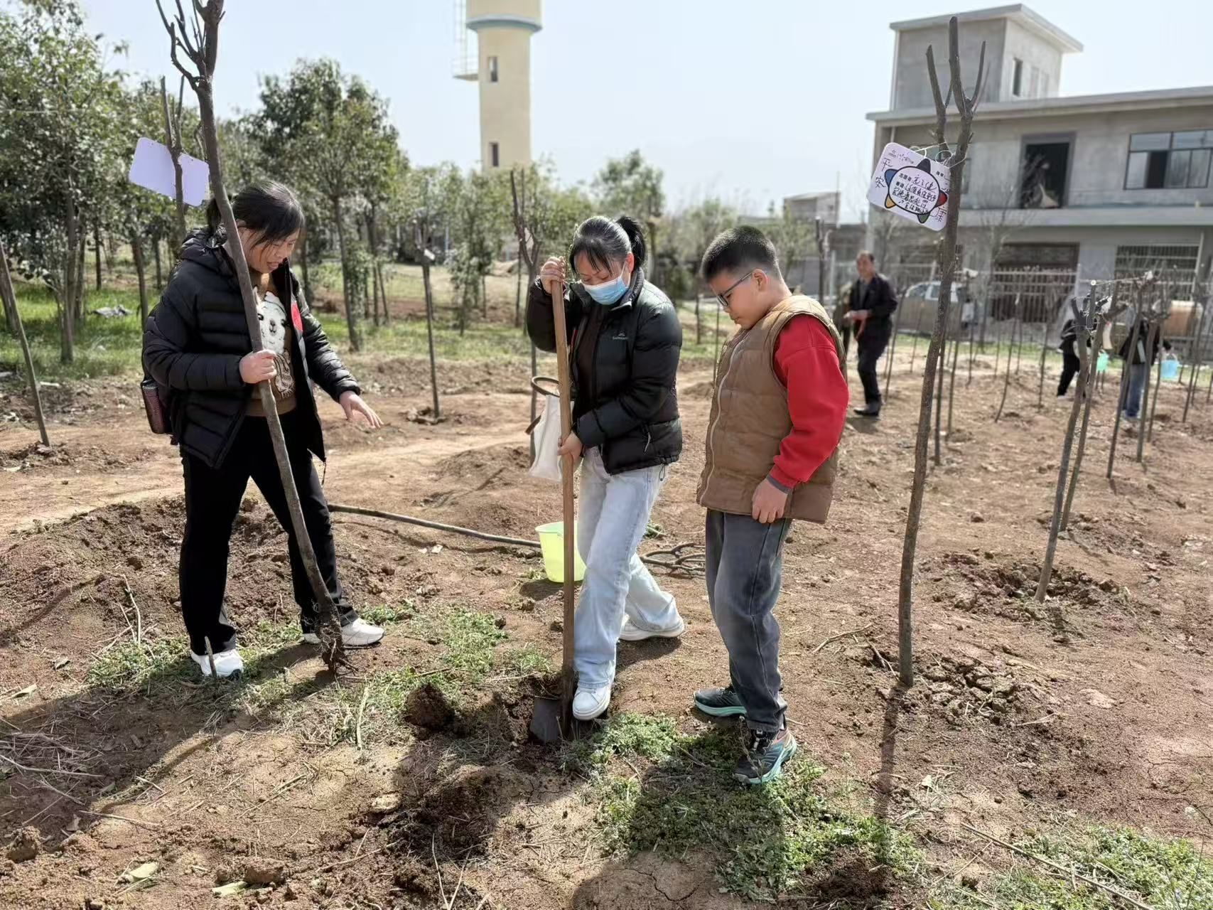 挥锹培土,浇水栽苗,