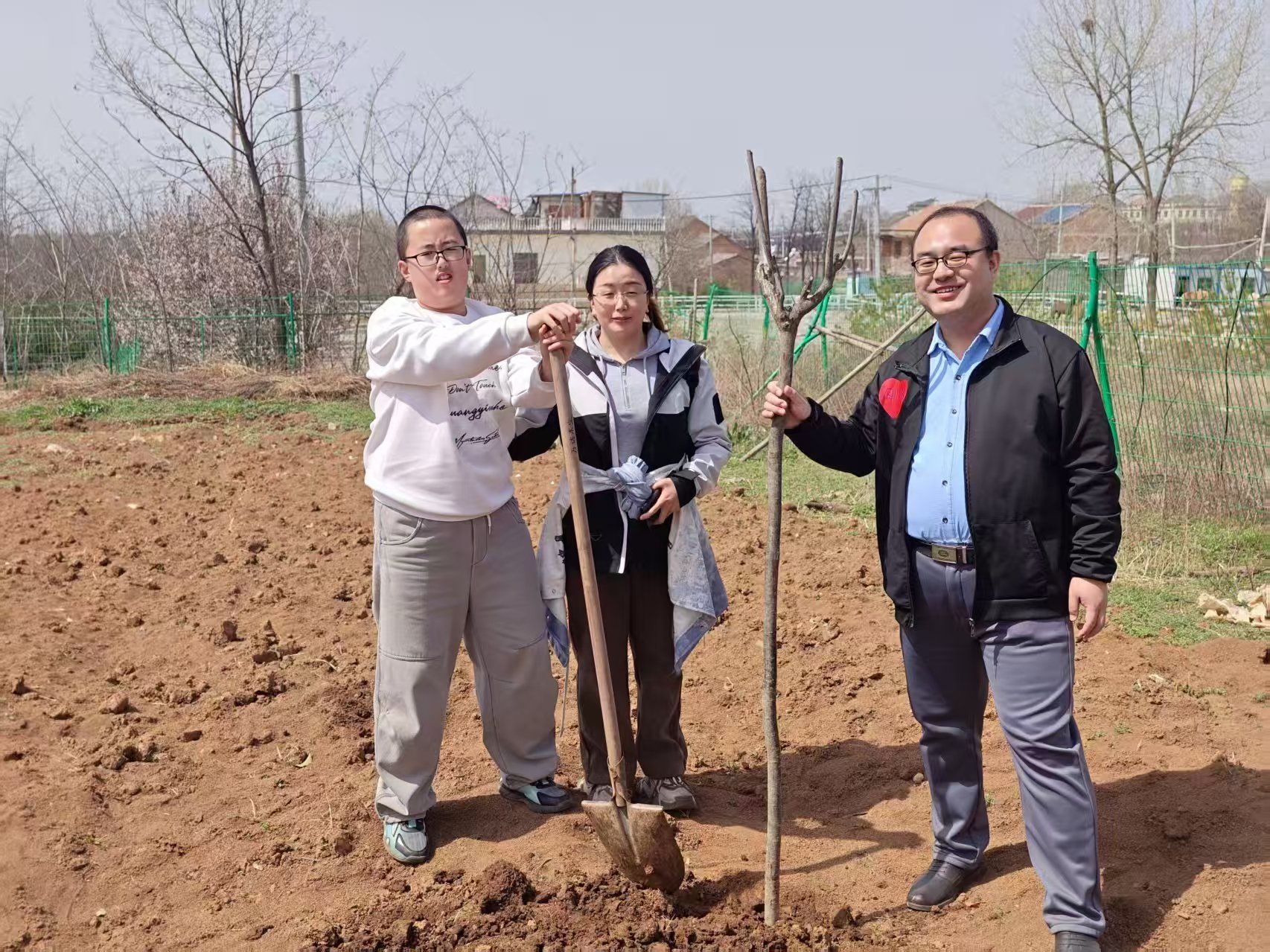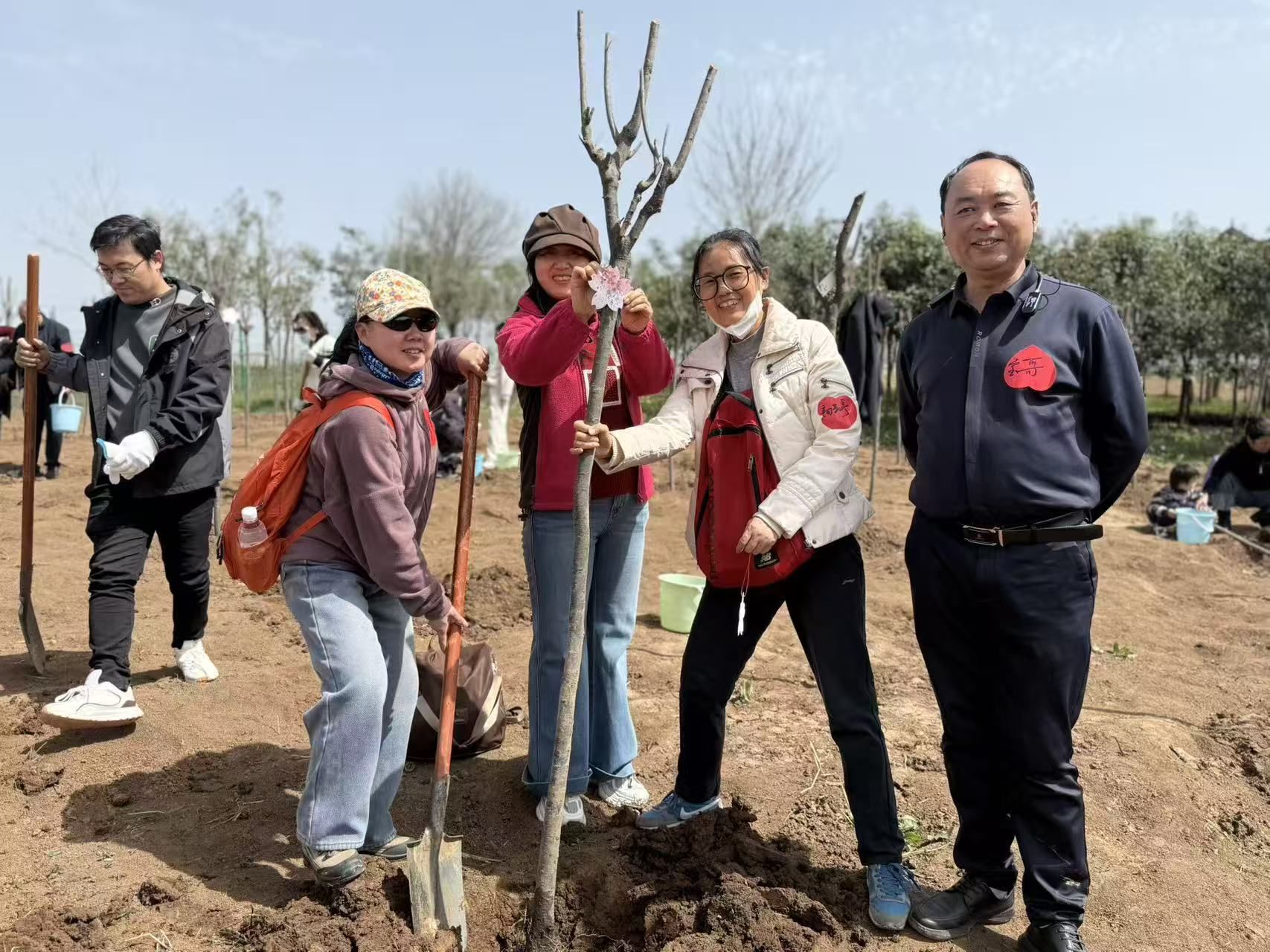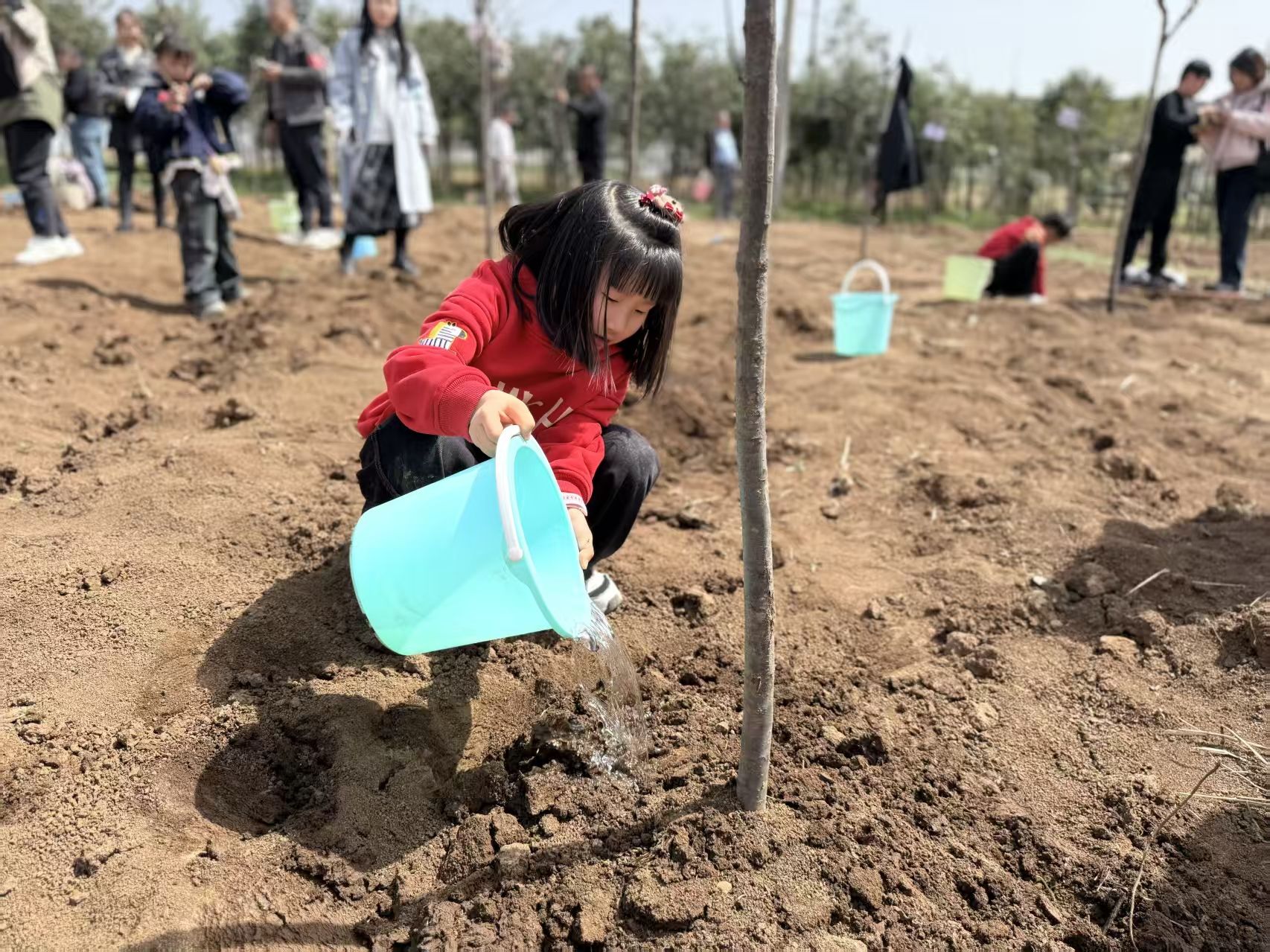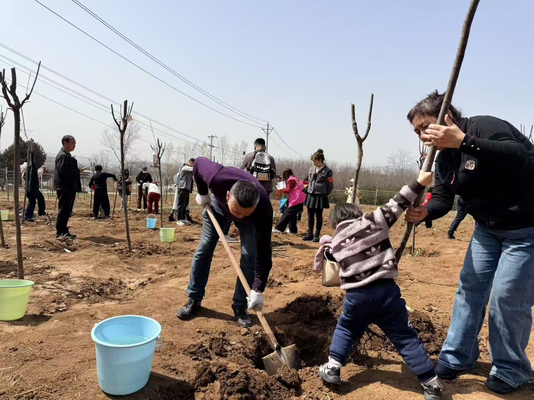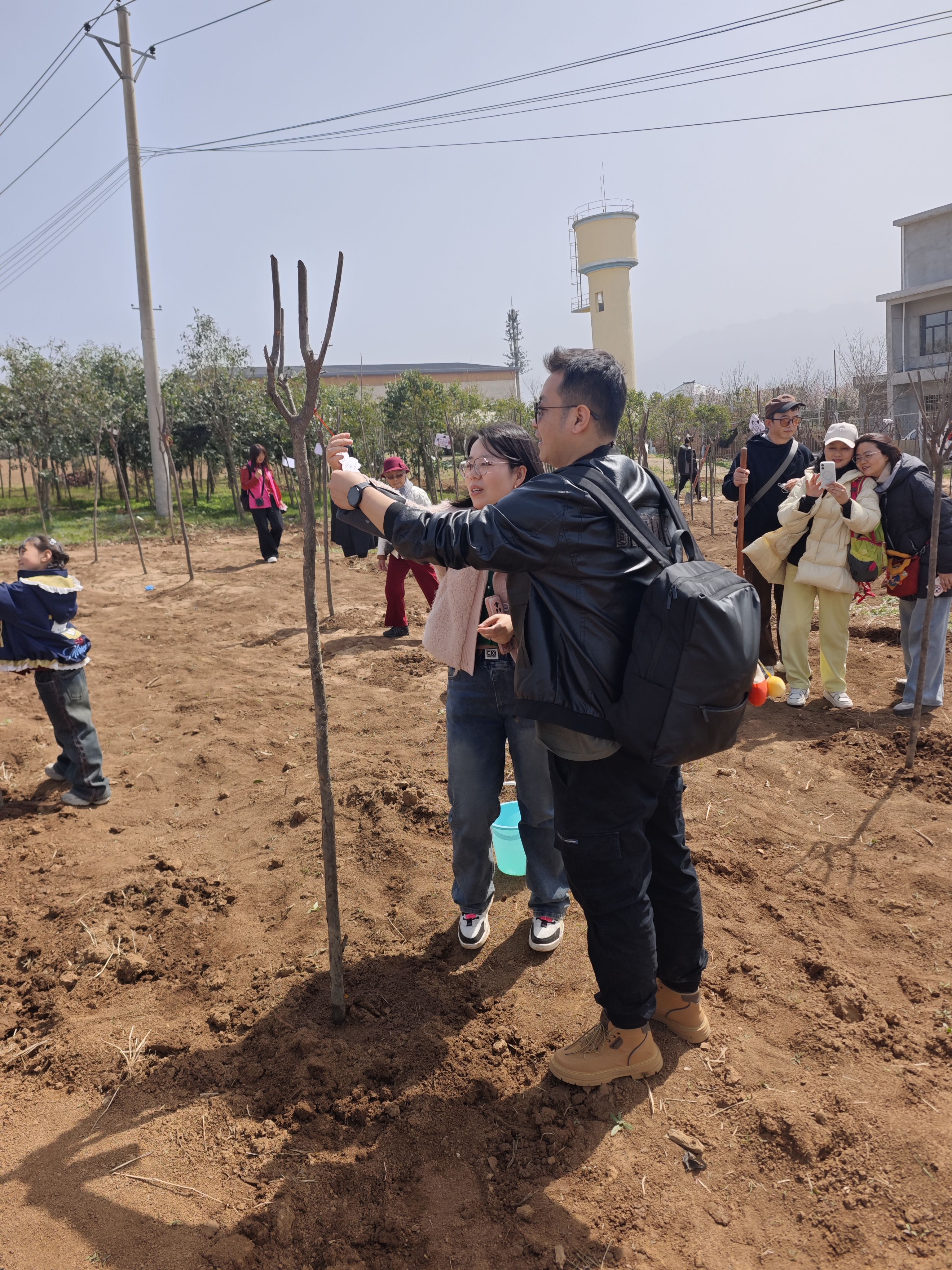 挥锹培土,浇水栽苗,